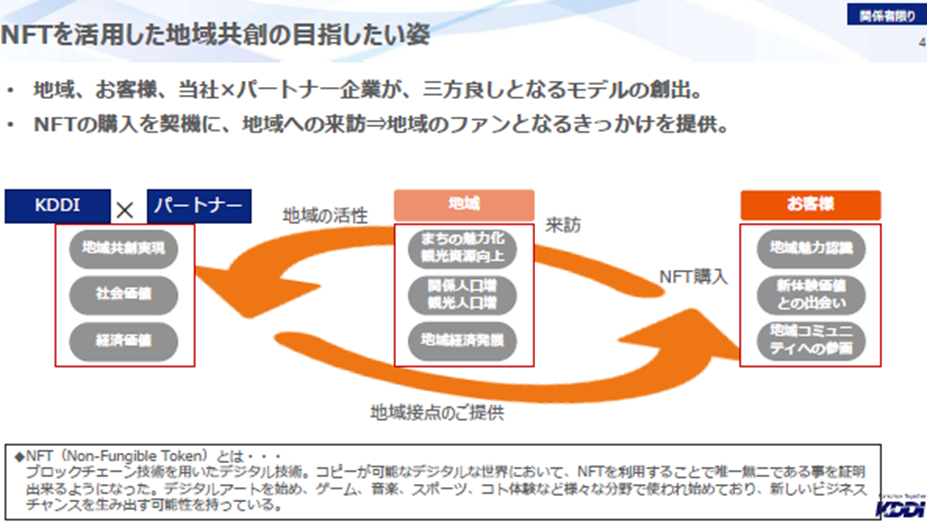 地域社会の抱える課題に向き合い、地域共創を実現するというテーマのもと、KDDI社からNFTを活用した地域共創の提案があったことから取り組みが始まった。