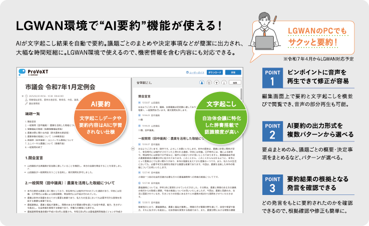 なお、この文字起こしツールにはクラウド型のサービスもあり、同市議会で活用されている。現在、スタンドアローン型とクラウド型は「VoXT One(ボクストワン)」としてアカウント統合され、共通で使える編集機能や、AI要約のLGWAN対応など、バージョンアップが進んでいるそうだ。こうした進化にも、三輪さんは期待を寄せる。「インターネット環境では使える範囲が限られてしまうので、LGWAN対応はありがたいですね。職員の活用もさらに広がるだろうと考えています」。