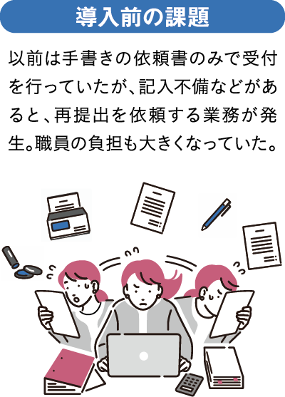 同課では、主に市県民税や国民健康保険税の収納を担当する。窓口で手続き対応を行う徳竹さんは「これまでは、受付時に口座振替依頼書を記入してもらっていました。その際、通帳と銀行印が必要になるのですが、持参を忘れて手続きができなかったり、金融機関に提出できても、印影違いや記入の間違いなどがあると差し戻されたりもします。そのたびに電話や郵送などで、修正の依頼をしなければいけませんでした」と話す。中には、住民が途中で手続きを諦めることがあり、機会損失につながることもあったという。