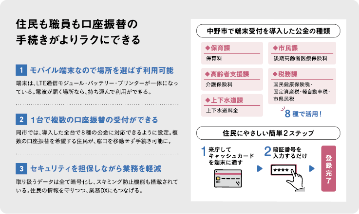 今後は、端末が持ち運びできる点を活かし、庁外で実施するイベントで口座振替への切り替えキャンペーンを行うなど、新たな利用法も検討しているという。「住民サービスに還元できるよう、積極的に活用して収納率の向上につなげたいです」と結んでくれた。