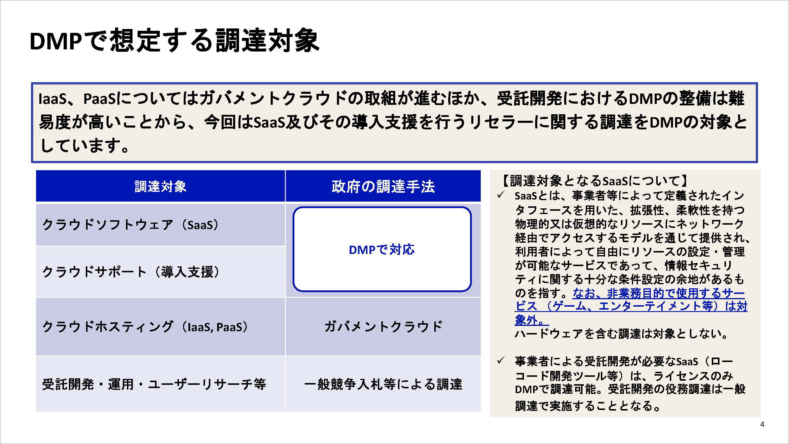 DMPは、調達対象がクラウドソフトウェアに特化している点が特徴です。また、SaaSサービスを提供するための導入支援サービスについてもソフトウェア会社または販売会社にて登録が可能です。登録できる対象は、行政機関が業務目的で利用するためのソフトウェアに限定され、ハードウェアは調達対象外となっています。