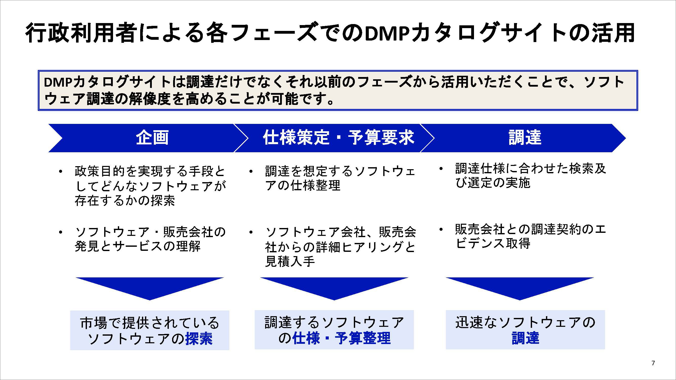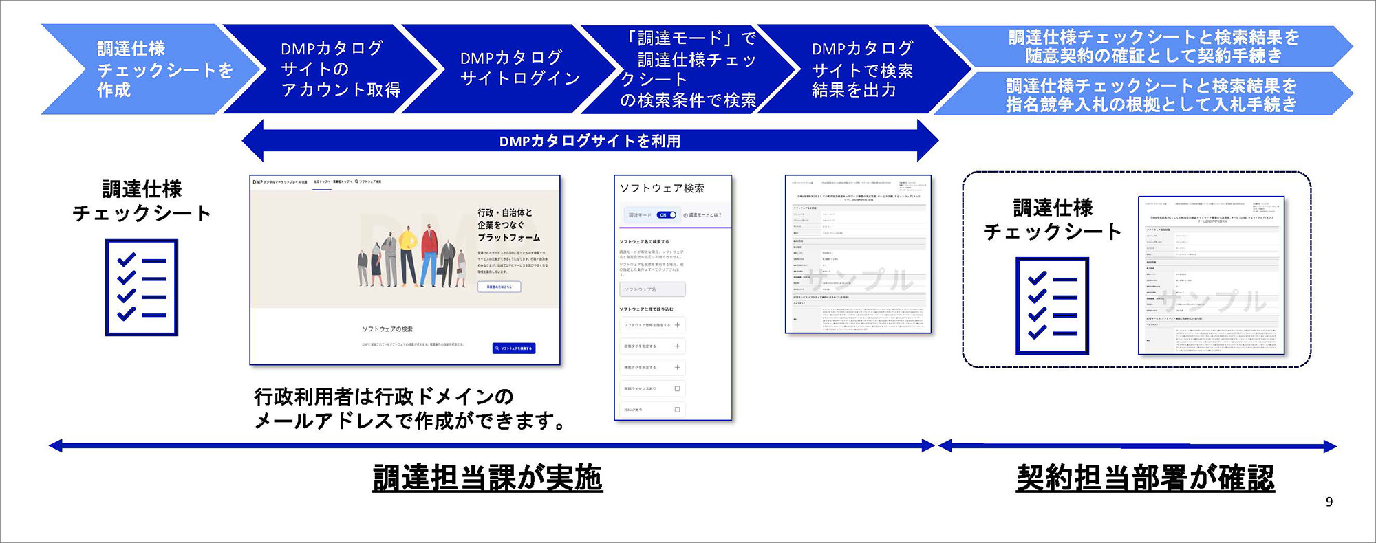 調達プロセスは以下の通りです。まず、行政利用者がDMPカタログサイトを利用して、調達仕様チェックシートにもとづいて検索を行います。このシートはカタログサイトの検索項目と連携しており、利用者が条件を確認しながら効率的に検索できる仕組みになっています。