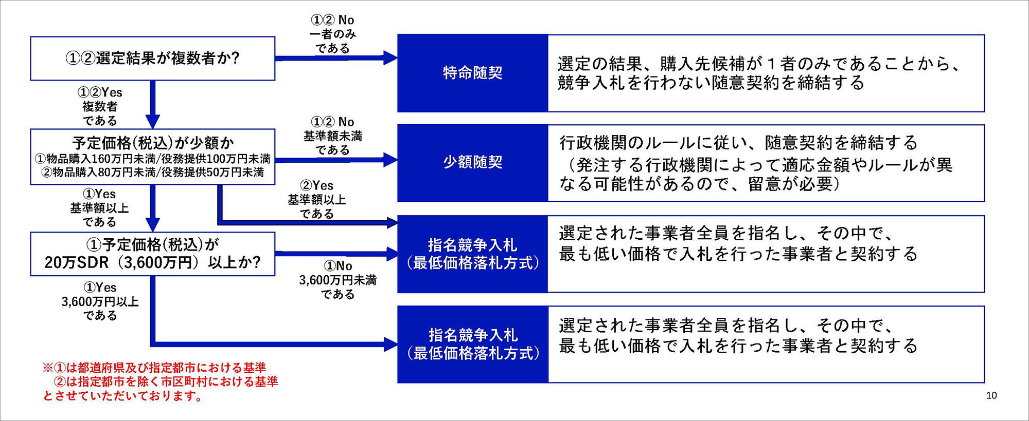 結果、一つの事業者に絞り込まれた場合は随意契約が可能で、複数の事業者が残っている場合は、指名競争入札で契約が進められます。これに関するフローチャートも提供されており、地方公共団体における調達方法が示されています。