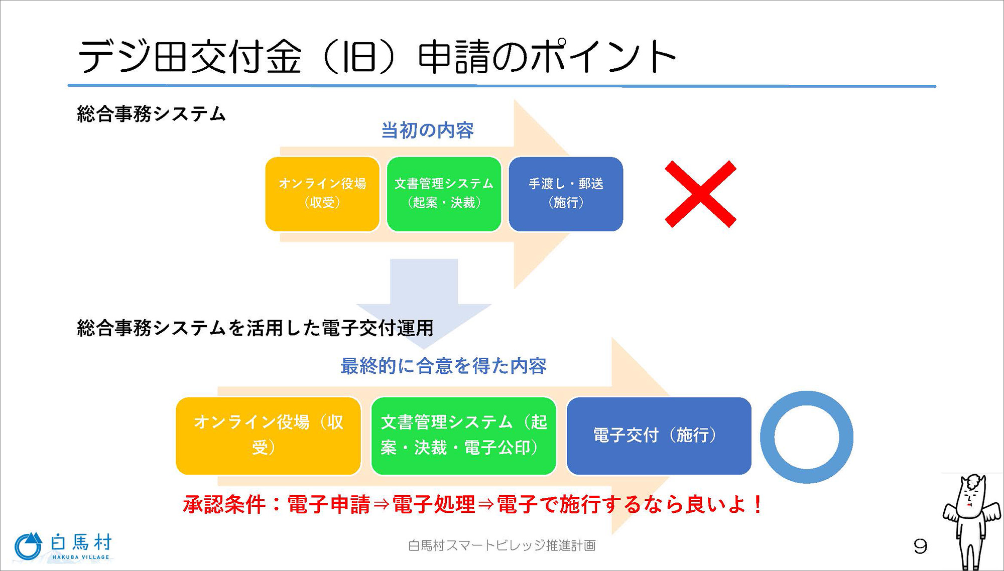 デジ田交付金申請のポイントを説明します。まず、LINEを活用したオンライン役場の構築から始まりました。文書管理システムをデジタル化し、最終の交付や施行の段階では、紙での手渡しや郵送を希望しましたが、この方法では申請の条件に合わないこと指摘されました。最終的には、総合事務システムを活用し、電子で交付することが条件として承認され、電子交付の重要性を初めて認識しました。