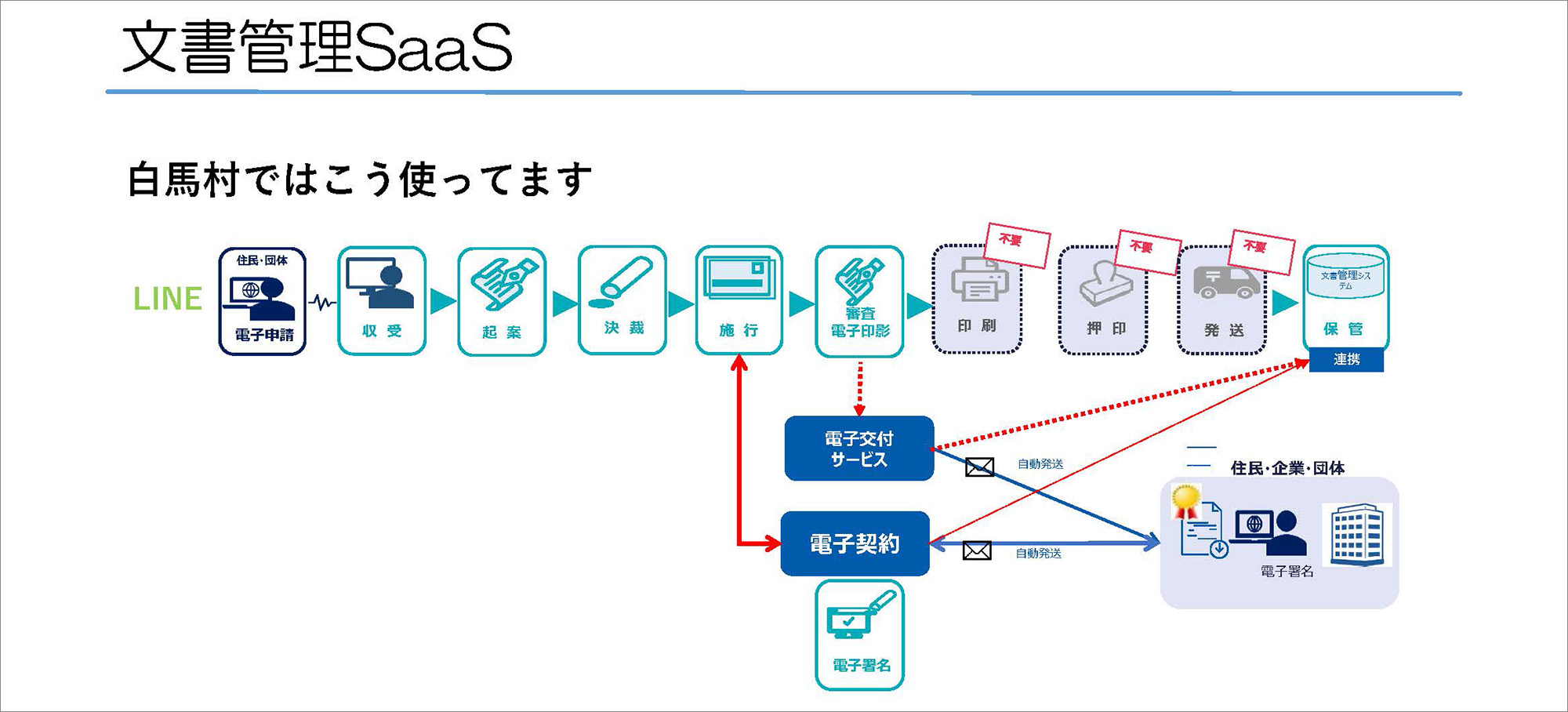 なお、文書管理SaaSを、当村では以下のように使っています。LINEを利用した電子申請を行い、その後、収受、起案、決済、施行の各段階で電子公印審査を通じて文書をシステムに保管し、相手に証書を電子的に交付する流れを確立しています。