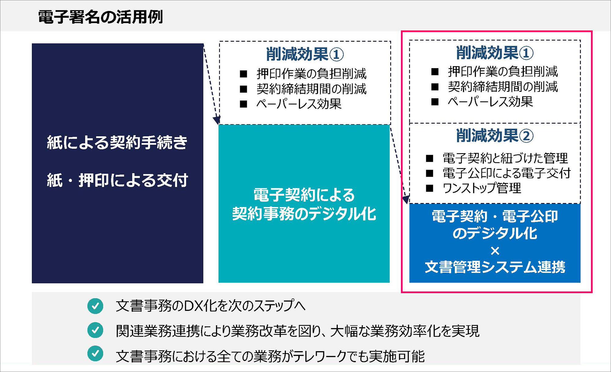 住民や企業の手続きがデジタル化されていく中で、文書管理システムは業務処理の円滑化に寄与します。電子契約の普及により、押印作業の負担が軽減され、契約締結までの時間も短縮されました。文書管理システムと連携することで、電子契約の保存や電子署名の利用が可能になり、業務効率がさらに向上しています。
