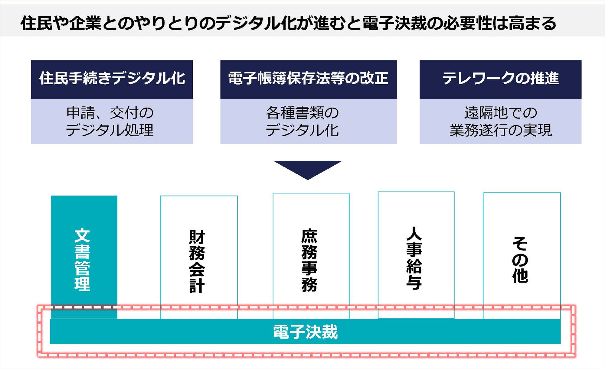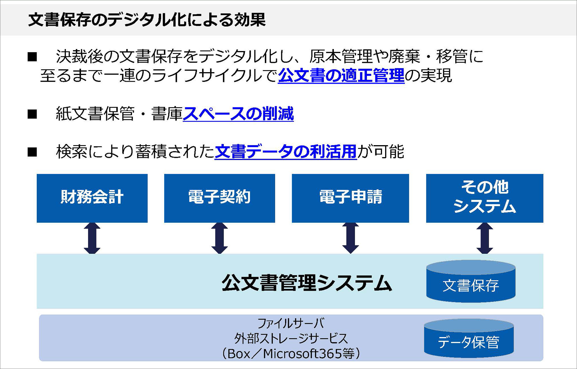 内部事務DXの基軸となるのが、公文書管理システムです。このシステムは、課題解決や業務効率化の基盤となるものであり、他のシステムとの連携が不可欠です。ここでは、文書管理システムに関連するDX化の3つのポイントを紹介します。