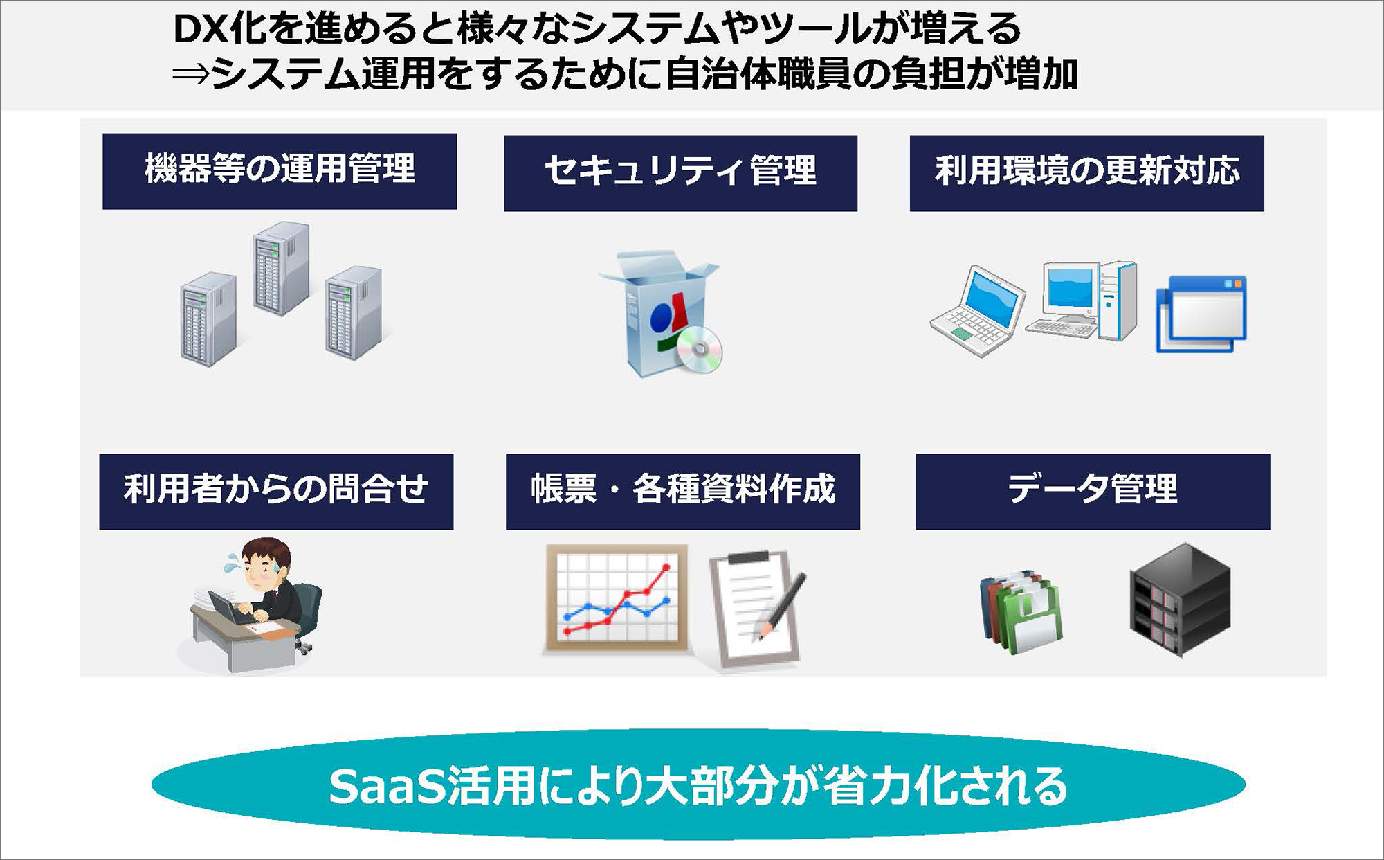 SaaSを導入することで、システムの整備や運用において職員の負担軽減とコスト削減が図れる点が大きなメリットです。自治体のDX化が進む中で、システムやツールが増えるにつれて、運用する職員の負担も大きくなります。こうした状況を改善するための有効な方法がSaaSの活用です。