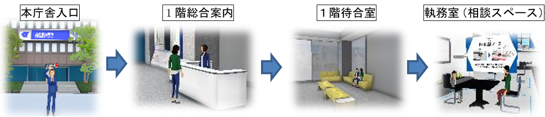 実際の区役所に来庁した場合と同様の「体験」を提供するため、“臨場感とライブ感を重視”し、実際の区役所を模して、区役所と同じ空間の構築を目指している。