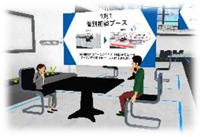 上記画像は、個別相談ブースのイメージ。ブース内では指定されたアバター同士のみの会話が可能であり、ブース外の第三者には会話内容は聞こえず、チャットや資料説明モニター(画像中央)の内容も見えないなどのセキュリティ対策が施されている。職員と相談者は資料説明モニターを活用し、資料を使った説明や電子申請の入力画面などを見ながら申請のサポートが可能である。