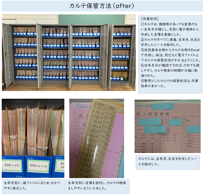 これまで紙カルテの検索や出し入れは、煩雑であることから主に事務員や雇い上げ者の役割であった。しかし、検索が容易になることで時間ロスやムダがなくなり、保健師、管理栄養士等が自ら紙カルテの抽出作業が行える。また、保管場所も1カ所に集約され、整然と整理されたカルテラックから、いつでもカルテを出し入れできる環境下はストレスがない。紙カルテの活用が容易になることは、住民への保健サービスをタイムリーに反映できる。
