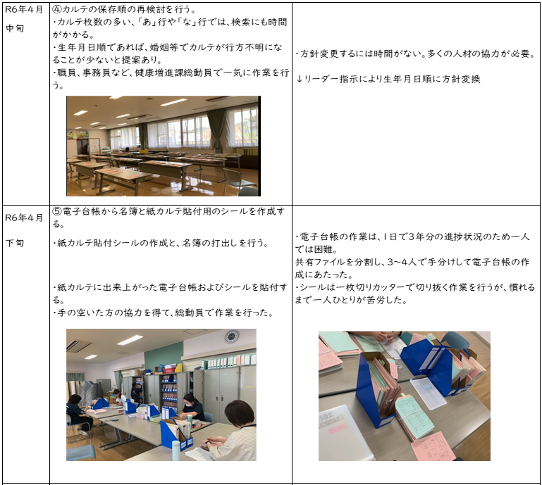 2. 思うような進捗がない場面では全体の進捗状況を加味してリーダーが人員の確保や増減を指示した。カルテ電子台帳の整備も一人で行うと、1日でわずか3カ年分の処理しかできない状況から、スタッフを3~4人に増員しスピードアップを図った。特に、電子台帳と紙カルテの突合作業には、いくら応援者が揃っても、電子台帳が追いついてないと作業にならなかった。