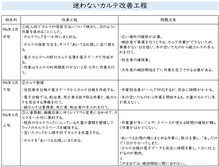 3. 当初、カルテの検索は、「あいうえお順」で振り分けていたが、特定の苗字が大量にあり、検索にかなりの時間を要し非効率であるという課題に直面した。その時点で、振り分け作業は3分の2程度進んだ状況だった。しかし、効率化が目的のため、カルテの出し入れに関係する多くのスタッフの意見を求め、改善点を整理することにした。カルテ作業に多く従事していた担当者から婚姻や転出入等でも変更がない「生年月日順に変更」の提案があった。「生年月日順」の方が検索が捗るという多くの賛同があったものの、この時点での方針転換は、作業が振り出しに戻ることになる。最終的にリーダーの決断と采配が肝であった。結果として、数字での判別は、ひらがなを検索するより、はるかに作業効率がアップした。