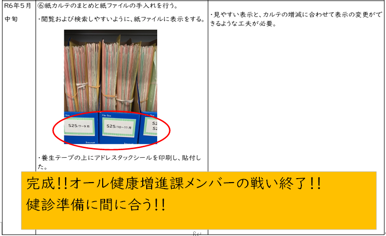 また、死亡、転出入の整備ができておらず、重複カルテや迷子になるカルテも多数存在していた。このことは、令和5年度から成人班で行っている「BPR(業務改革)」で改善が必要である工程であることに気づき、改善行動の後押しとなった。そこで、過去から先輩保健師とともに積み上げてきた住民の貴重な健康情報を、今後スムーズに電子化に移行できることを視野に入れ、効率よく閲覧検索ができるカルテ整理を行うこととなった。