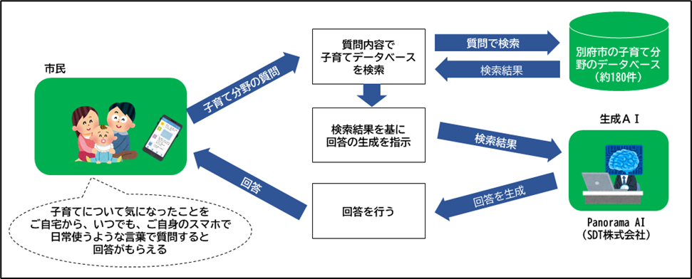 ・技術的にはRAG(検索拡張生成)※2を活用し別府市データベースの中から生成AIが回答を生成するような仕組みを構築した。
