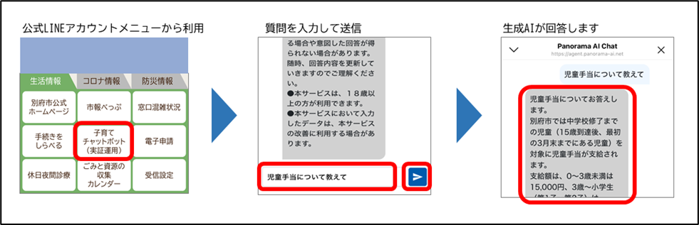 実証運用の利用方法としては、別府市LINE公式アカウントのメニューから自分が知りたい質問を自然言語形式で入力するだけである。