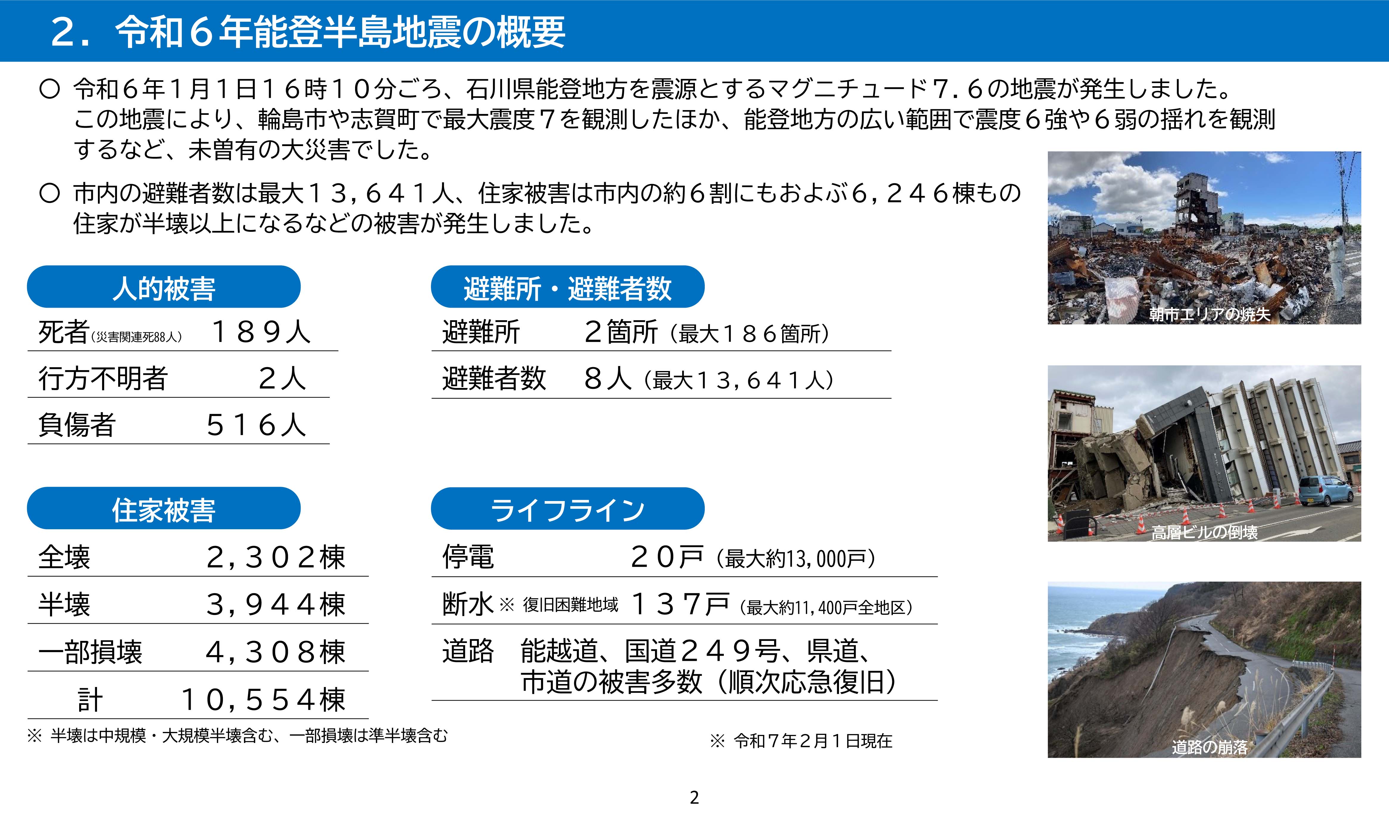 まずは能登半島地震の概要です。令和6年1月1日に発生した能登地方を震源とするマグニチュード7.6の地震で、輪島市は最大震度7でした。本震の4分前に地震があり、私も「市役所に行かなければ」と準備している最中にドスンという縦揺れがあった。その後すぐに津波の警報も出て、市民がパニックになったのです。