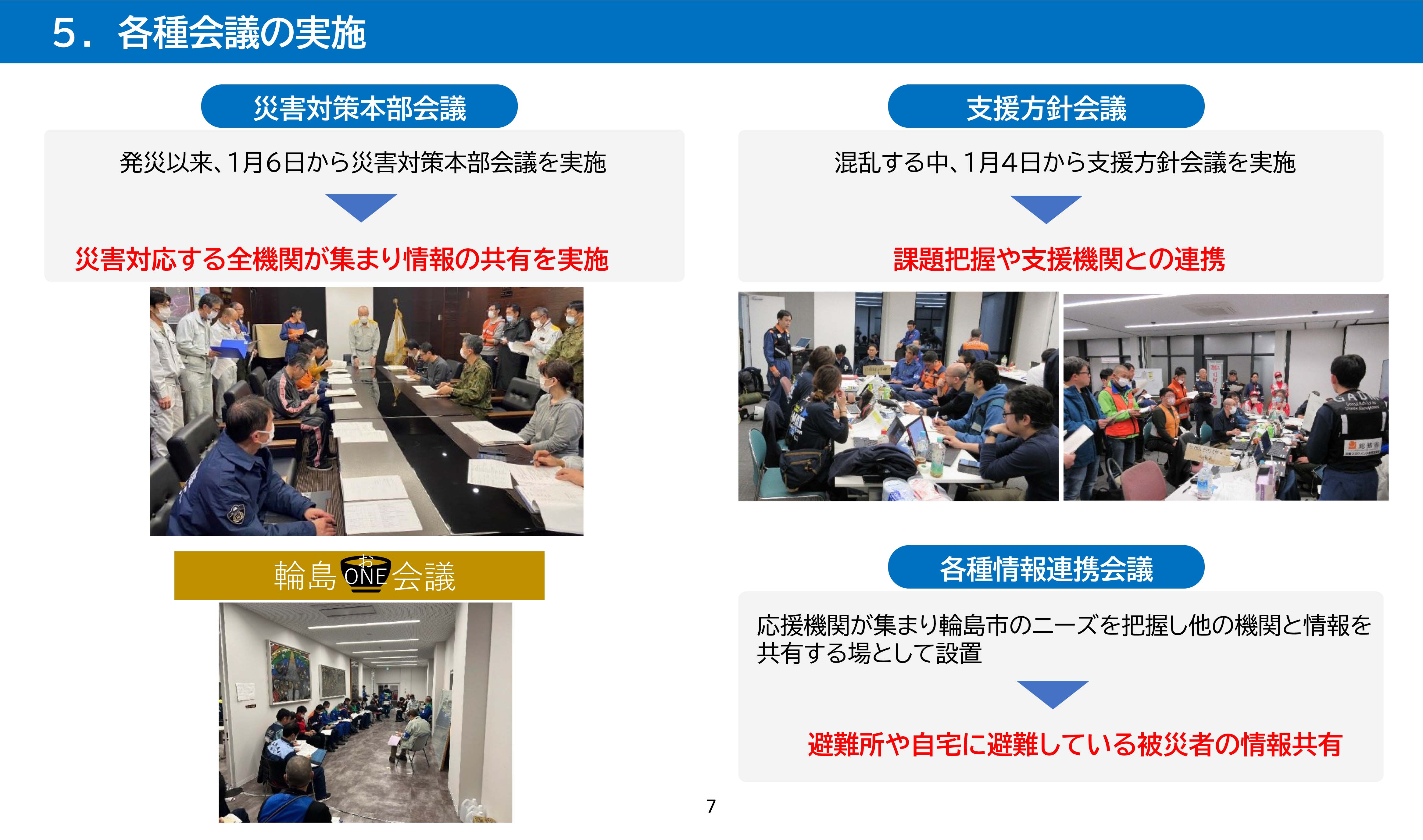 とにかく人手が足りず、全く身動きが取れなくなる中、総務省災害マネジメント総括支援員、および対口支援職員の受援が始まります。しかし市役所の中は、津波警報が出たこともあり市民であふれていて、会議室すら確保できません。これではまずいということで、1月5日に市役所近隣の輪島高校を避難所として設け、市民はそちらに移動。その後、対口支援の部屋を確保しました。それから各種会議が始まっていったのです。
