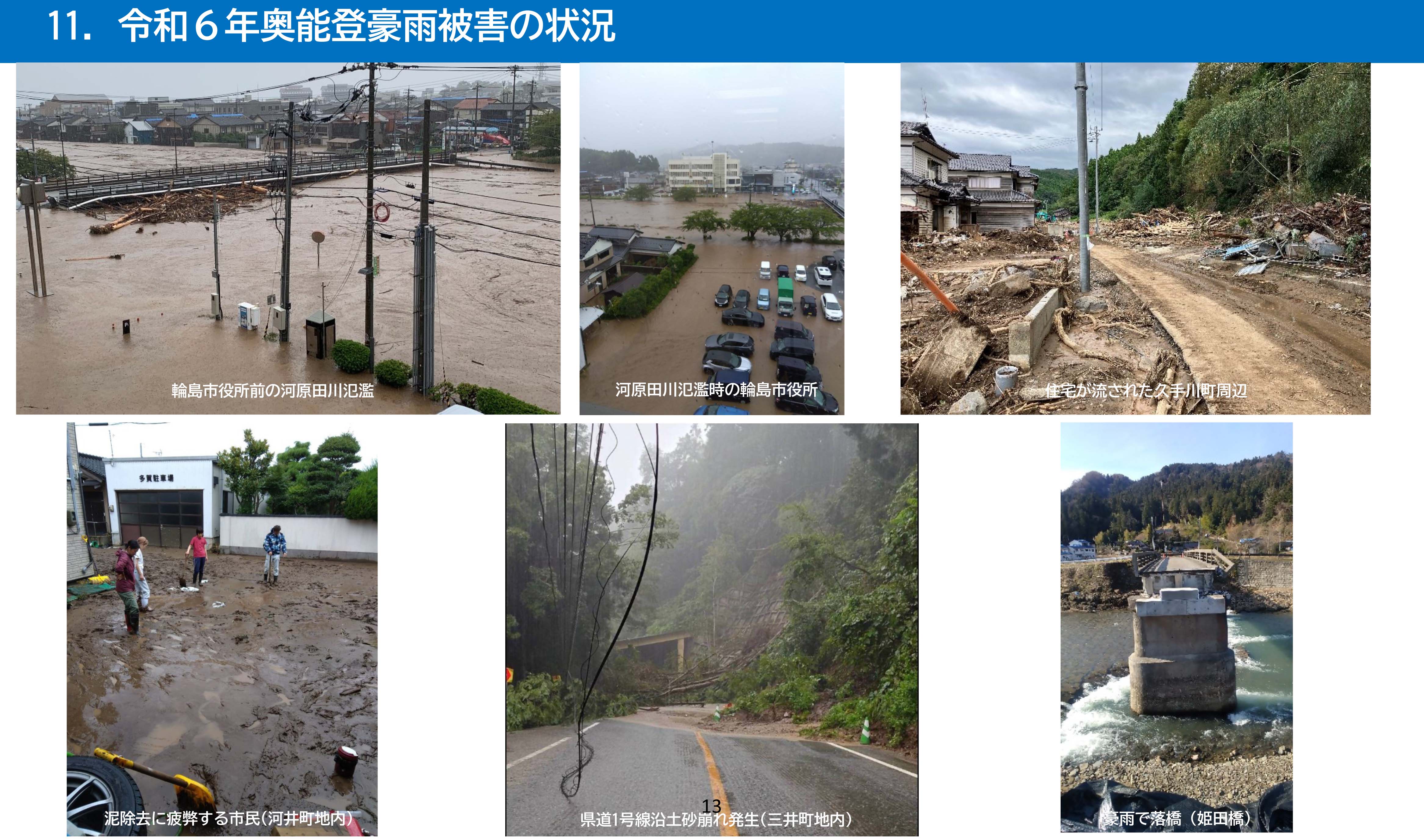 奥能登豪雨は、当市で1時間121ミリという猛烈な雨でした。市内各地で土砂崩れが起き、道がふさがれ、再び孤立した状況が発生。そうした中で11名が犠牲になっています。住宅も1134戸に被害が出ました。避難所は最大で40カ所、985人が避難していました。ライフラインも停電、断水など、地震と同じような状況です。
