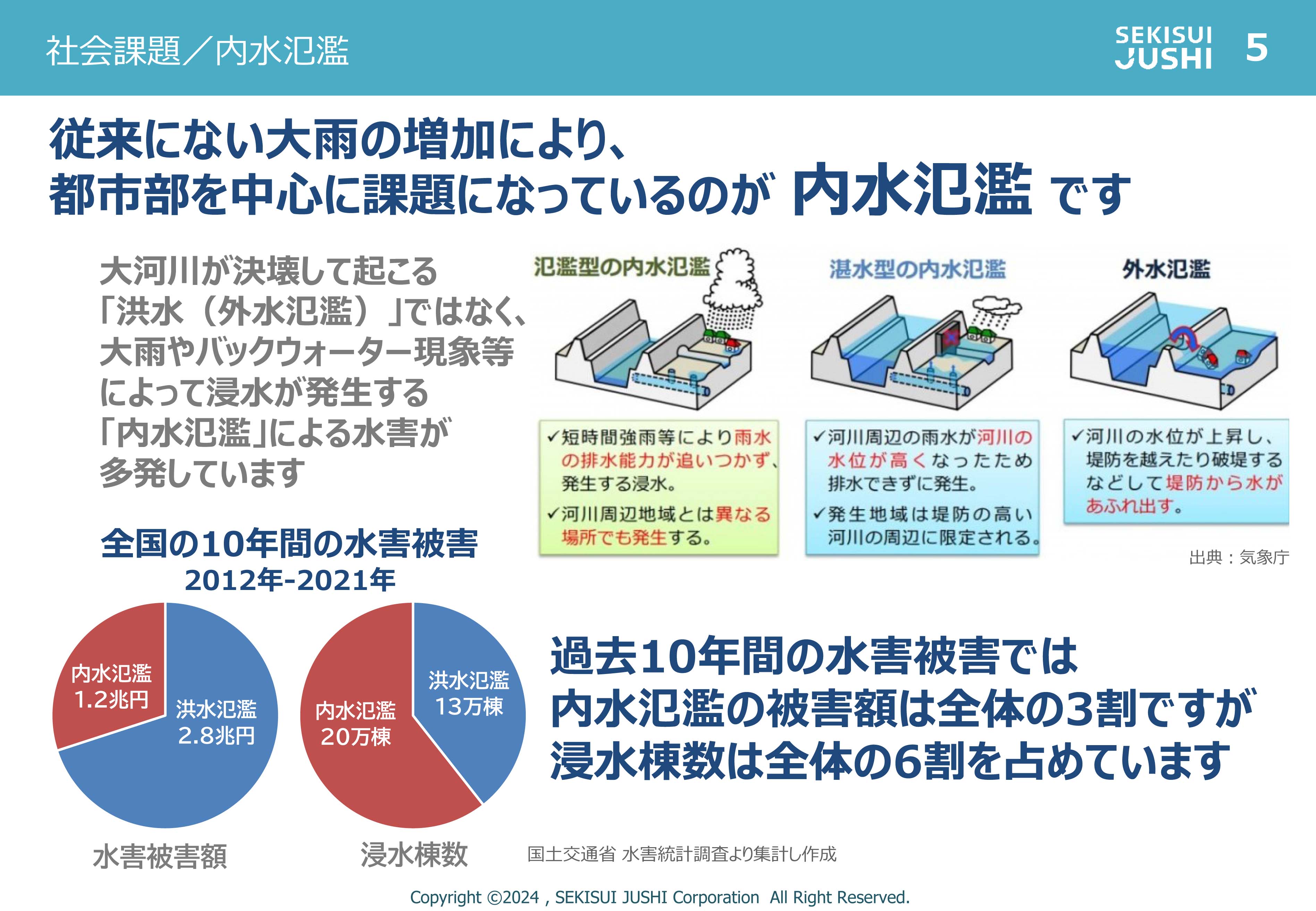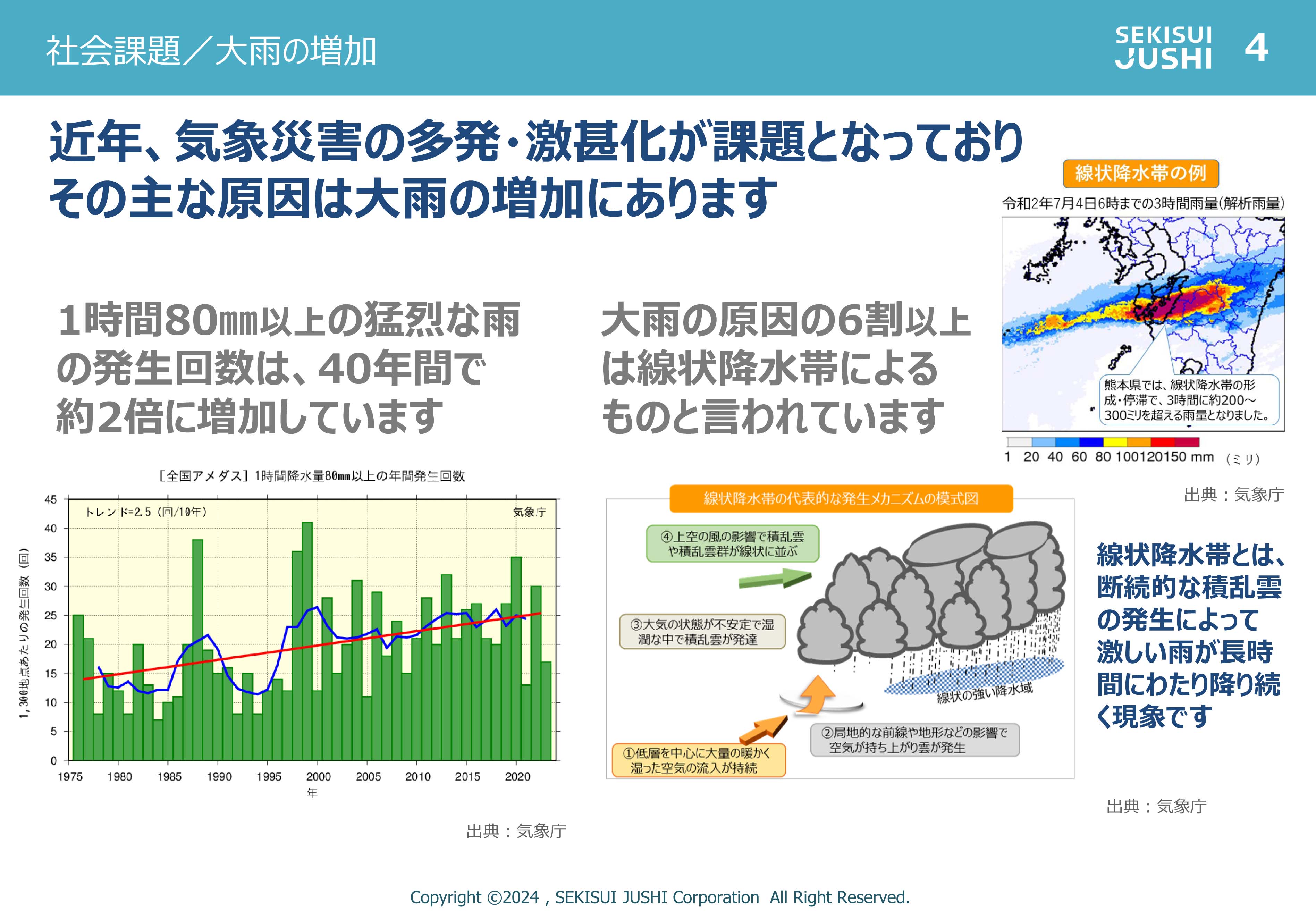 近年の社会課題の1つに、大雨の増加があります。1時間80ミリ以上の雨が増えており、6割以上は線状降水帯によるものですが、これによって引き起こされるのが内水氾濫です。