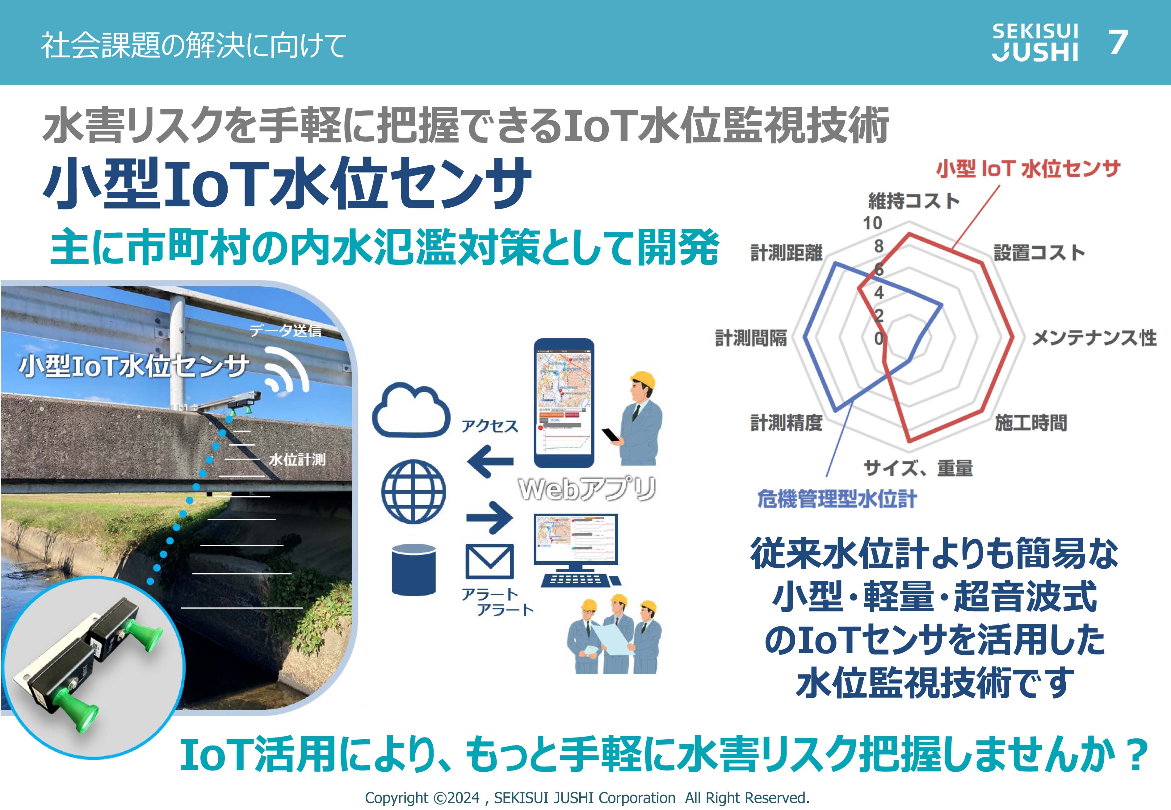 積水樹脂の出来と申します。私は企業だけでなく、防災NPOでの活動もしており、国や自治体の話を聞く機会が多くあります。その経験をもとに、自治体での事例をまじえつつ、災害時の人手不足時に遠隔で水位を把握できるシステムについて紹介します。