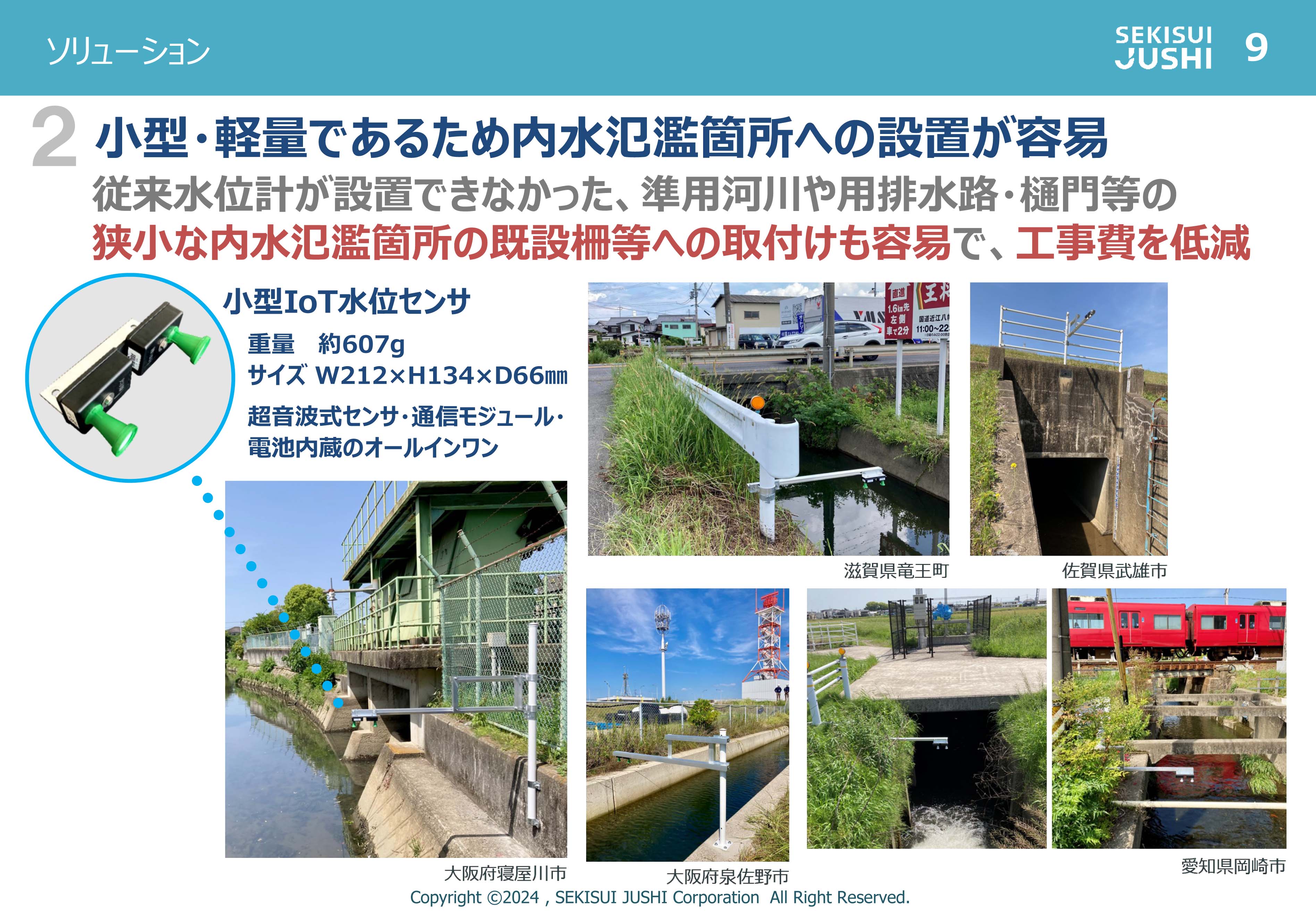 2つ目は、小型・軽量なので内水氾濫箇所への設置が容易だということ。内水氾濫箇所は狭い現場が多いのですが、河川の防護柵などへの取り付けも簡単で、工事費の削減にもつながります。