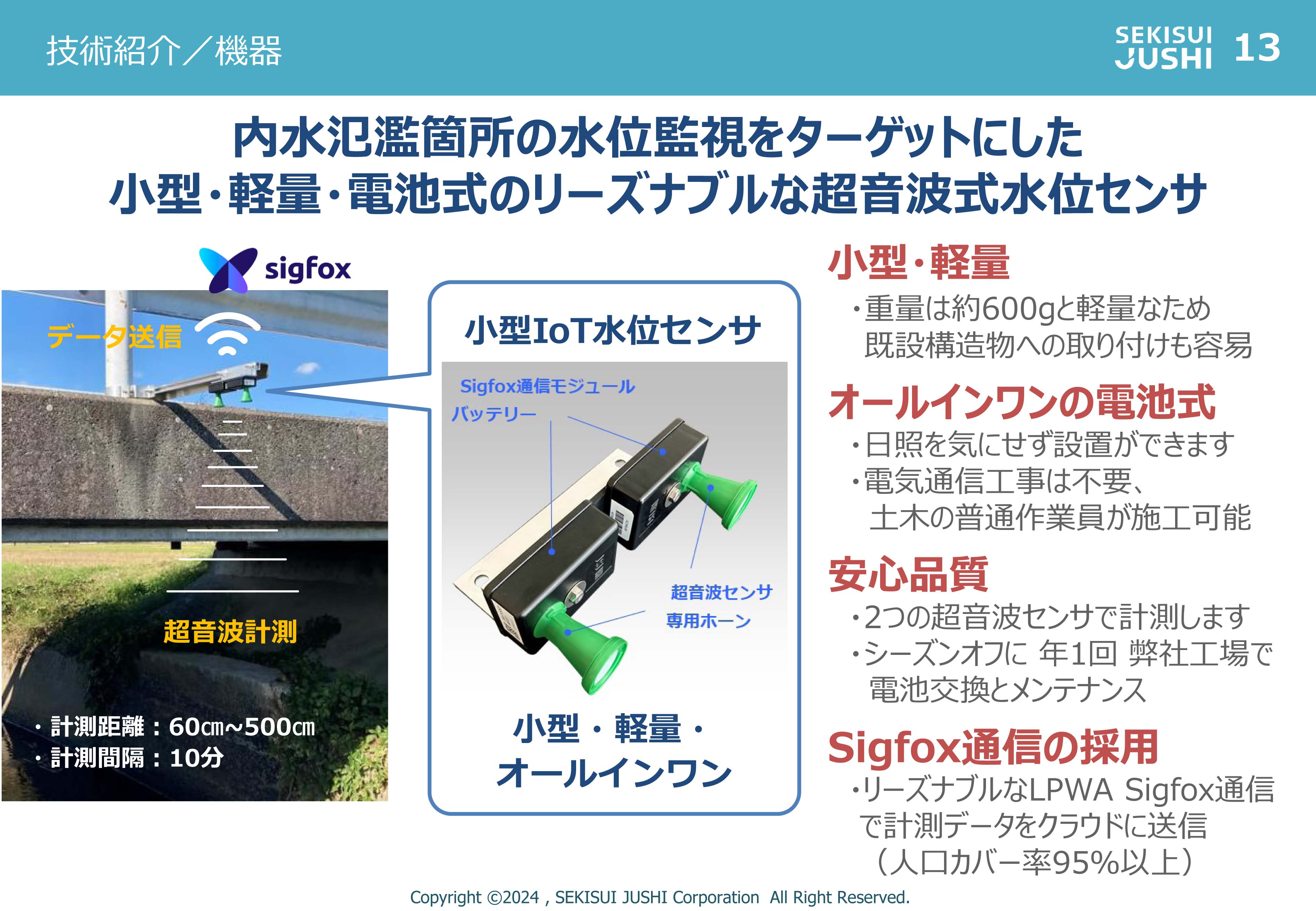 これは、市町村が管理している内水氾濫対策の箇所向けの対策として開発されたセンサで、従来の水位計よりも小型・軽量な超音波式の水位センサとなっています。この製品が持つ5つの強みを説明します。