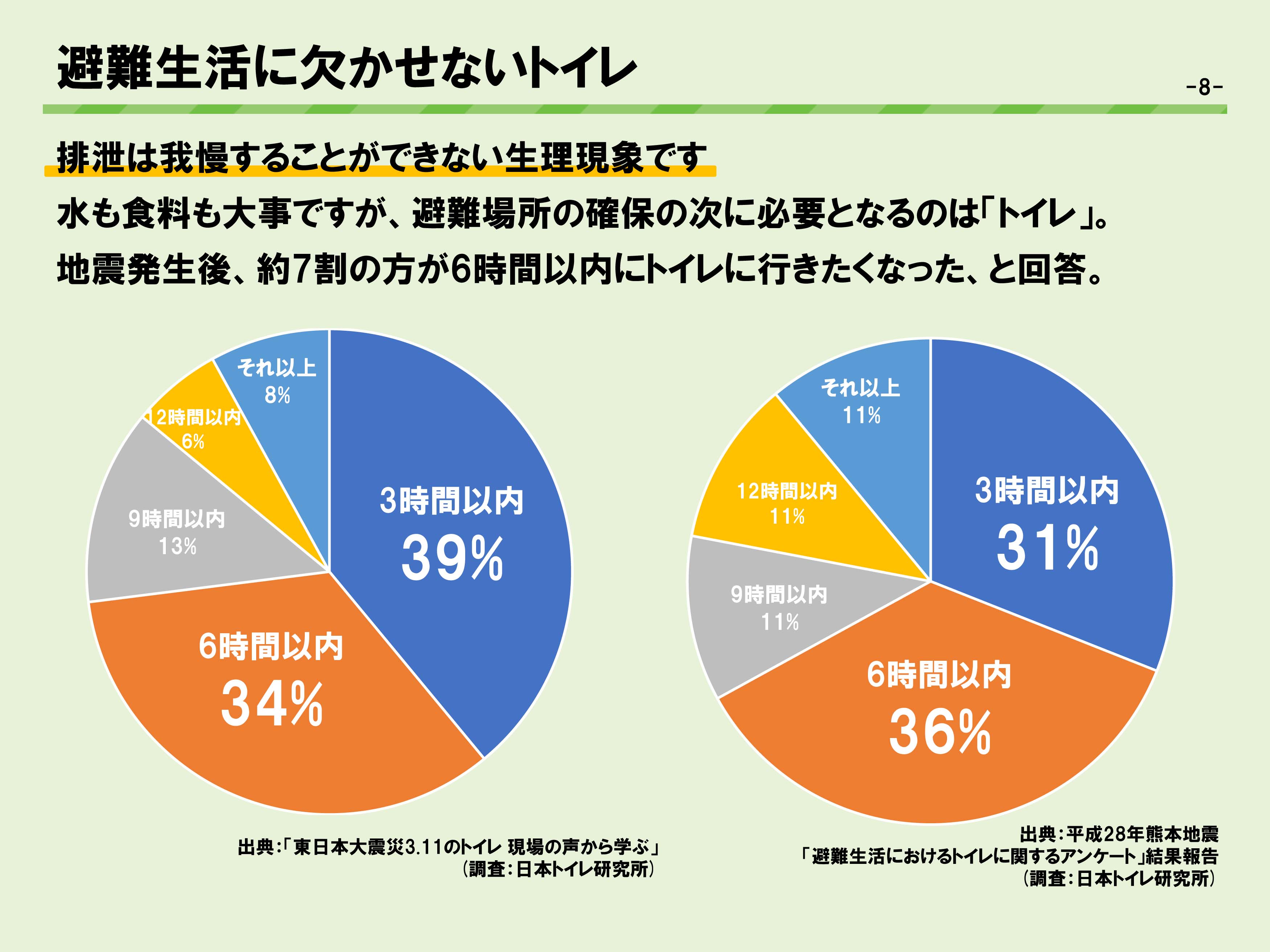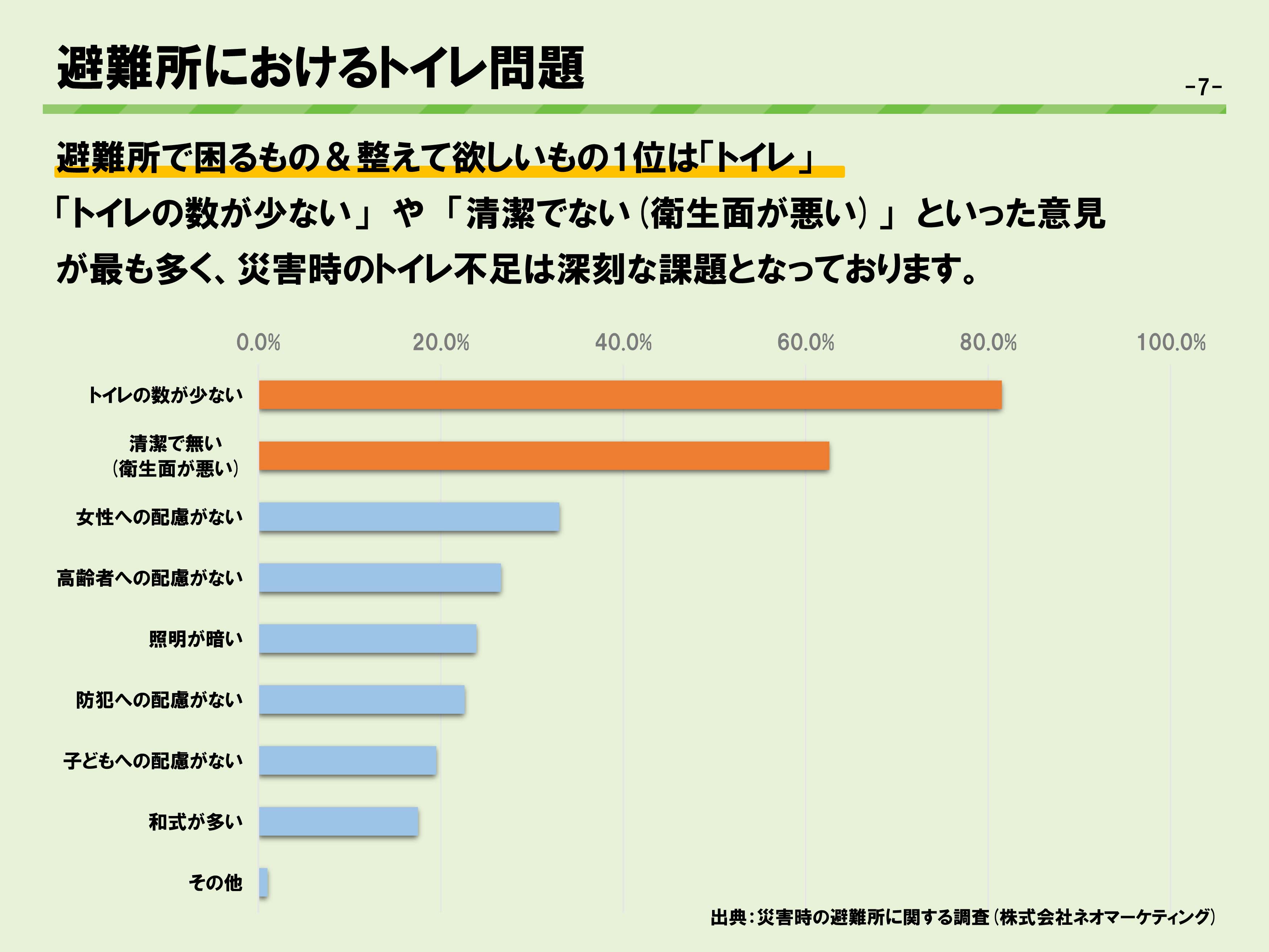 十分な数のトイレの備蓄が必要だという意識は浸透してきていますが、数だけではなく、菌のまん延やにおいの問題を排除した衛生的なトイレを備えておくことが被災者の安心につながるのだと分かります。
