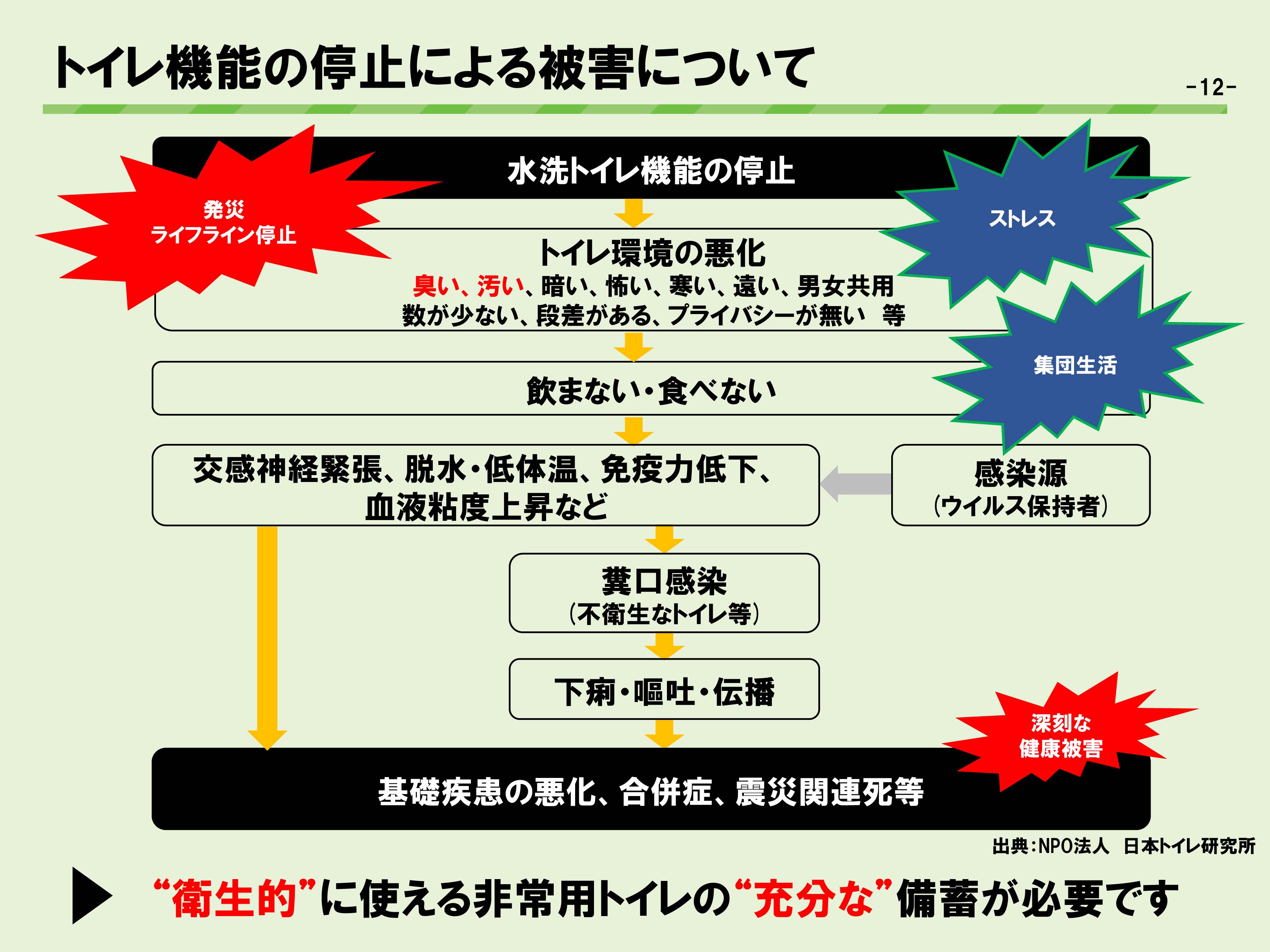 次に、早い段階で生じたのがトイレ問題です。上下水道の水道管が損傷し、トイレが使用できなくなりました。食事は1日3回ですが、トイレは1日平均5回だと言われています。つまり食事より早い提供が求められるといわれております。