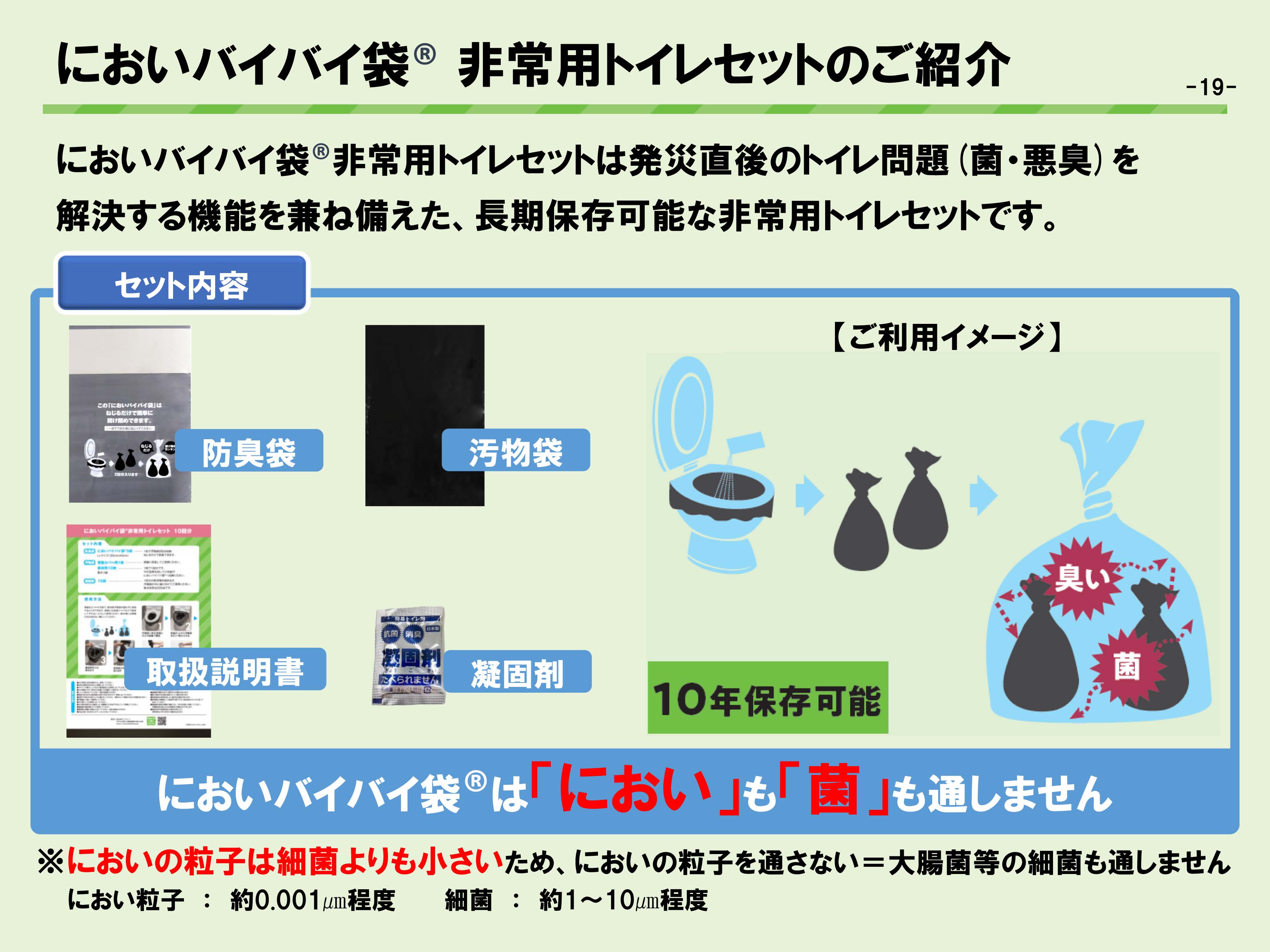 今後も、国内では様々な災害の想定が必要な状況です。その中で、水や食料だけでなく、衛生的なトイレを備えるということも大切。今回紹介した防臭袋を備蓄することで、被災者の生活の快適性も大きく変わってくると思われます。ぜひ各自治体の非常用トイレの備蓄を考える上で、重要なポイントとして捉えていただけると幸いです。サンプルが必要な自治体があれば、ご連絡ください。