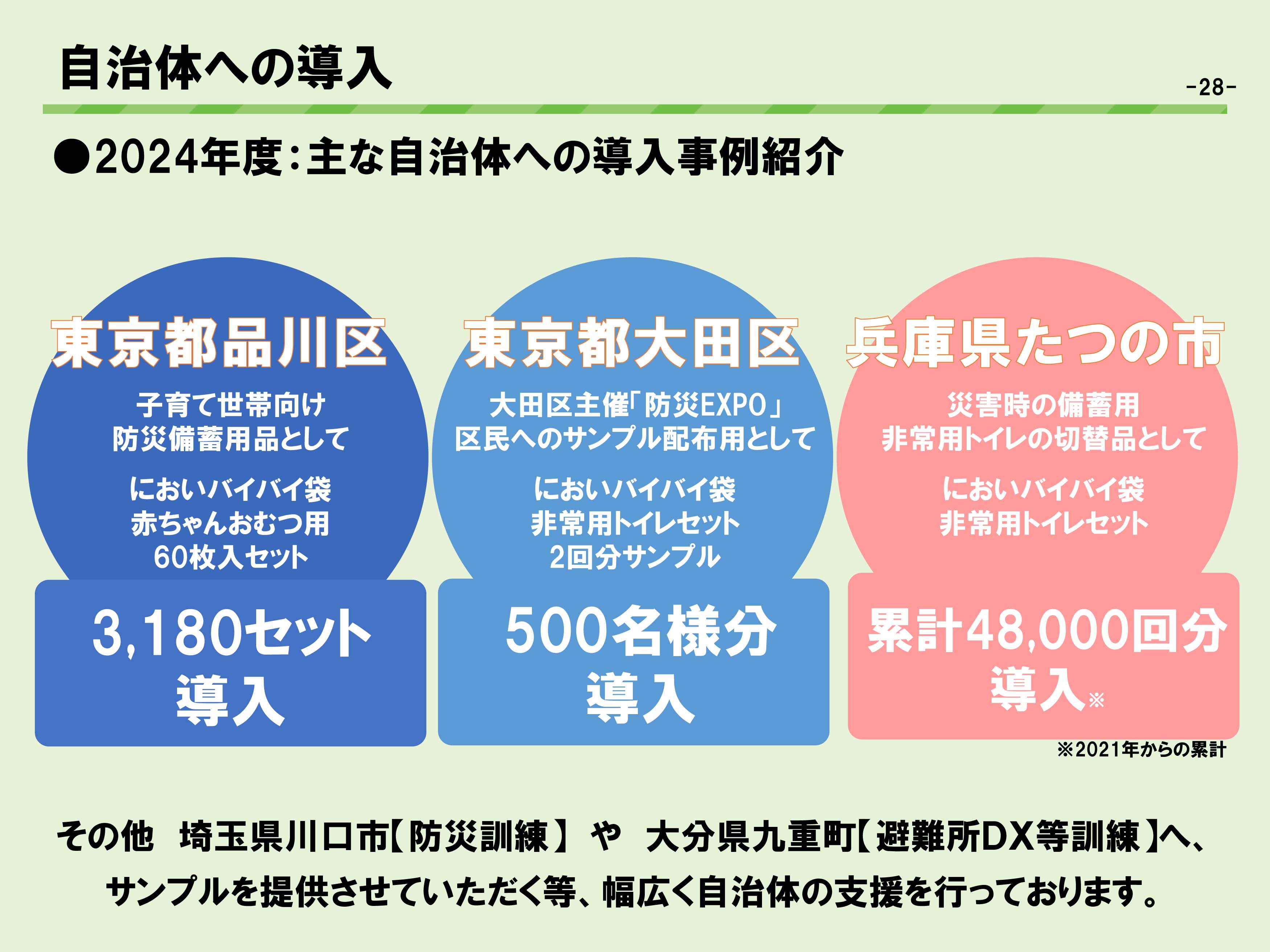また大田区では、区が主催した防災EXPOでの配布品として、非常用トイレセットの2回分サンプルを500名分納品しました。アンケート結果でも好評で、防災意識向上の一助になれたと考えています。