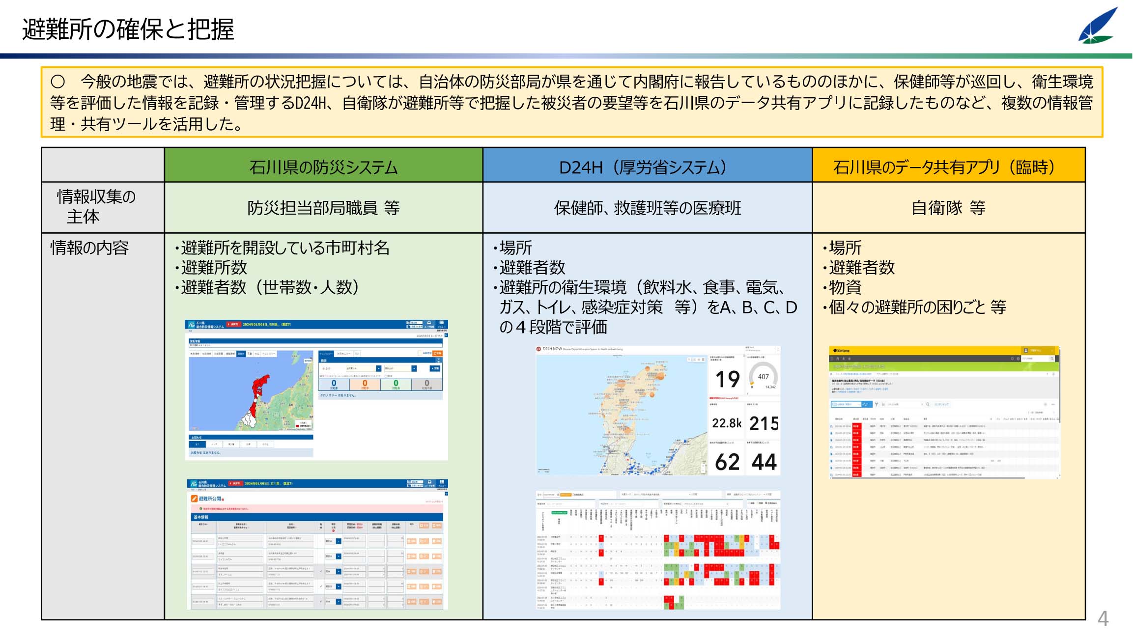 災害に対しては、十二分な事前対策を講じる必要があり、想定を超える避難者が生じる恐れがあるため、例えばあらかじめ避難所を多めに指定しておくことや、能登半島地震のような臨時の避難所が開設された際にどのように把握するかということ、また県又は市区町村の防災システムにどのように臨時避難所を追加するかという想定を事前に行っておくことが重要です。
