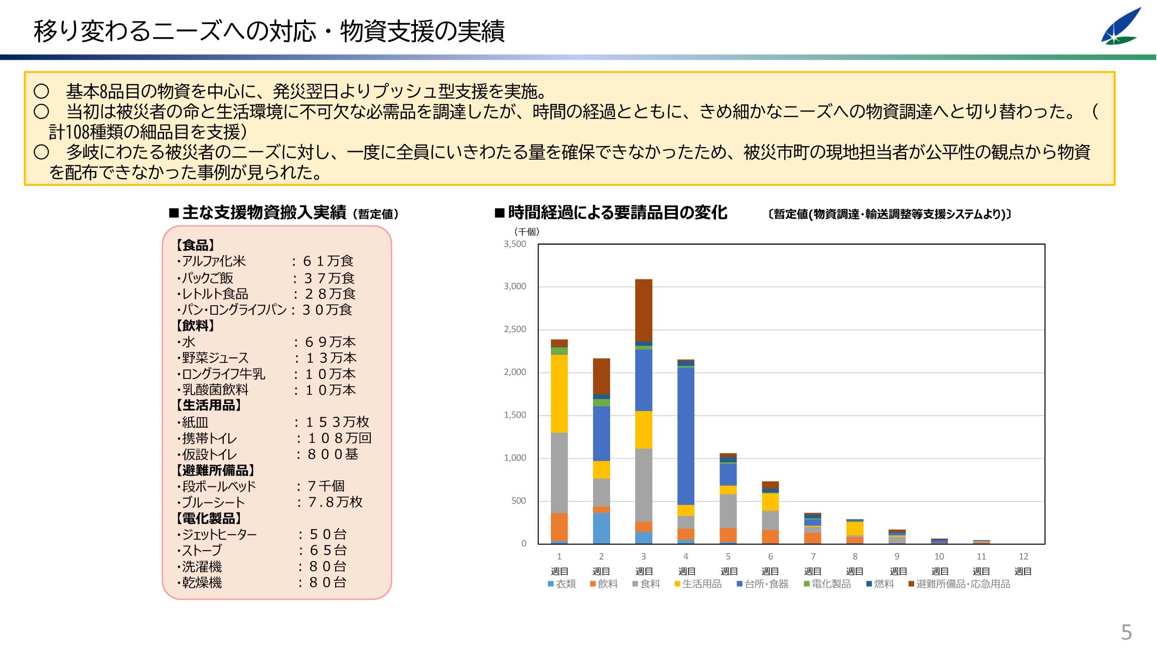 今回の能登半島地震では、市町の想定を超える避難者が発生したこともあり、発災直後に十分な備蓄が避難所に供給されていたかというと厳しい部分があったかと思います。状況を改善するために政府では、物資のプッシュ型支援を実施しました。発送した物資については、発災後2日目に石川県の備蓄倉庫に到着し、3日目に県が被災地まで輸送したと聞いています。そう考えると、少なくとも3日分の備蓄は重要であり、支援物資も県・市区町村の物資拠点から避難所へ、どう運ぶのかを事前に検討しておく必要があります。