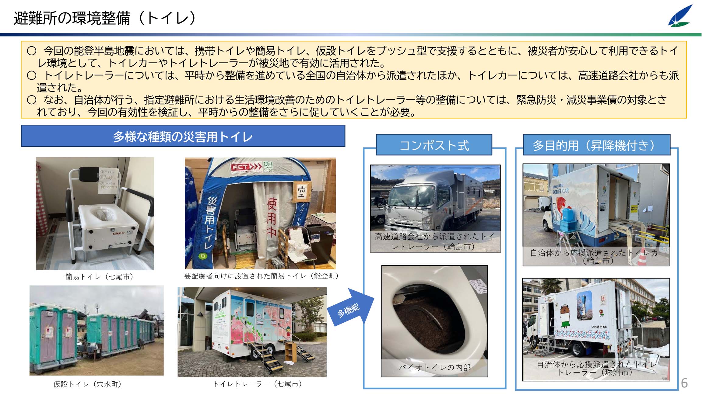 内閣府では、トイレ問題に対するため、発災直後よりプッシュ型支援として、携帯トイレや簡易トイレ、仮設トイレ等を現地に提供しております。また、高速道路会社や自治体から、トイレ環境を備えたトイレカーが多く派遣され、被災地のトイレ環境が確保されました。