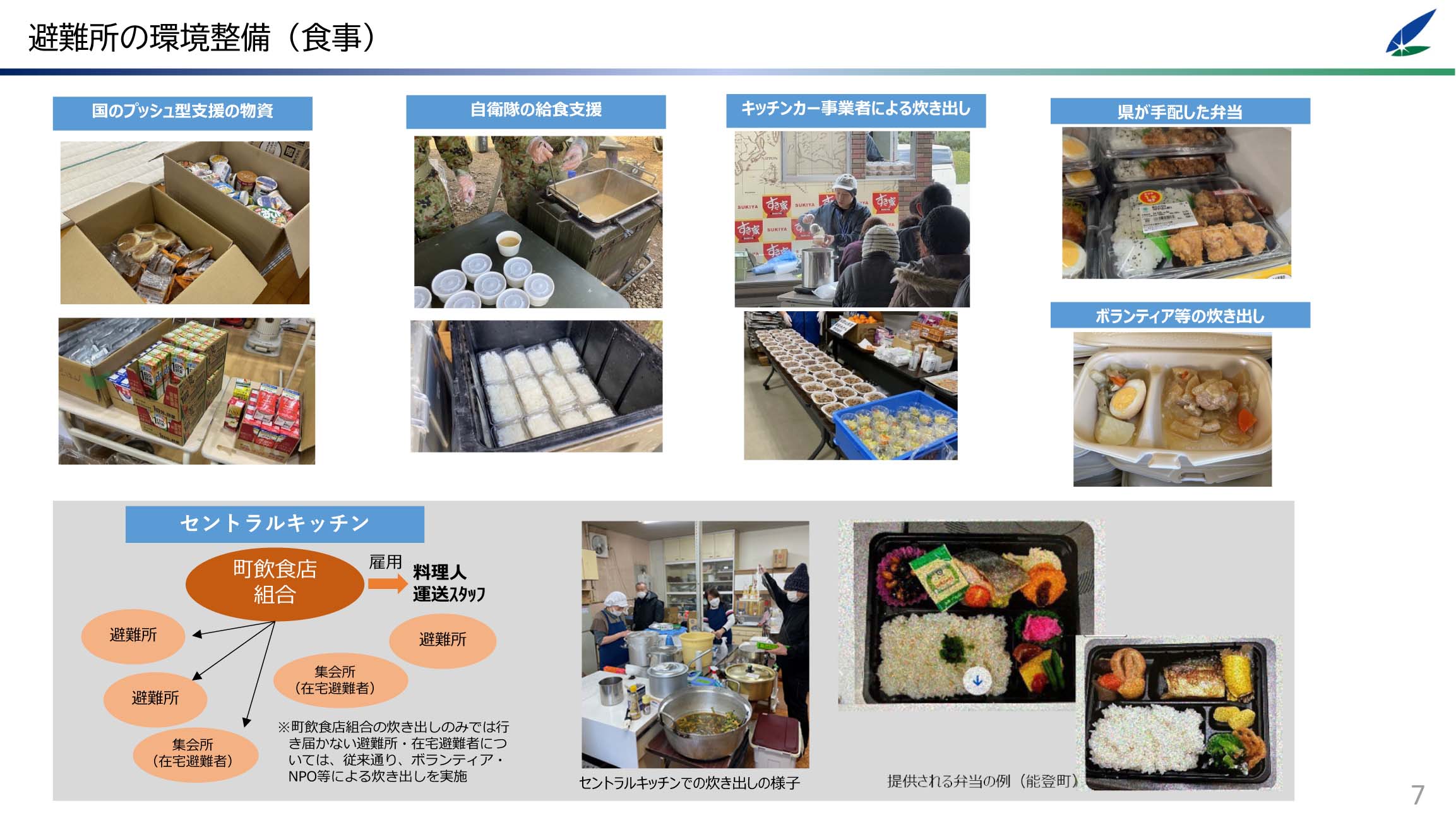 トイレと同時期に起きたのが食事の問題です。自衛隊による給食支援、プッシュ型支援による多様な種類の食品の提供、NPOやボランティア団体、キッチンカー事業者の炊き出し等、様々な方法で食事が調達されました。時間の経過とともに温かい食事や、栄養を確保した食事のニーズが高まっていくことを感じ、1日でも早く被災地の食事環境を安定されるため、内閣府と被災自治体、NPO団体等が協力して、「セントラルキッチン方式」という手法を実践しました。