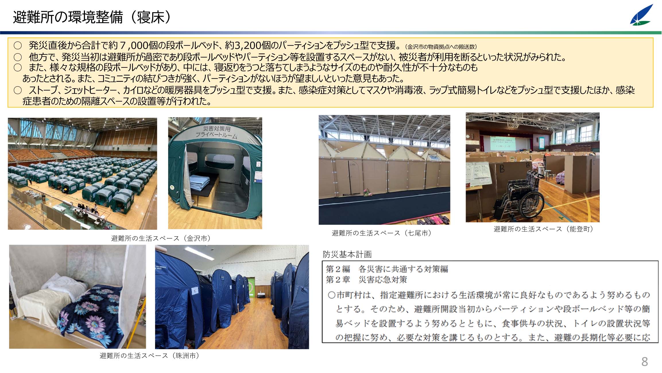 トイレ、食事の次に問題になったのが、寝床の環境です。避難所で雑魚寝すると、埃などによって呼吸器疾患のリスクがあると言われており、災害関連死を防止するためにも、簡易ベッドの設置が必要です。今回の災害でも、プッシュ型支援によって簡易ベッドを発災直後から現地へ提供しました。一方で、今災害では、普段布団で寝ている避難者も多かったようで、避難者自身がベッドの使用に抵抗がある等、ベッドやパーテーションの設置を進めることに苦慮しました。避難所においては、避難者の避難が進んでいる時点では、避難所のレイアウトを再構築することは住民理解を得づらい傾向もあります。内閣府としては、今災害での反省も踏まえ、令和6年に防災基本計画を改定し、段ボールベッド等の簡易ベッドやパーテーションを避難所開設時から設置していただくことをお願いしています。