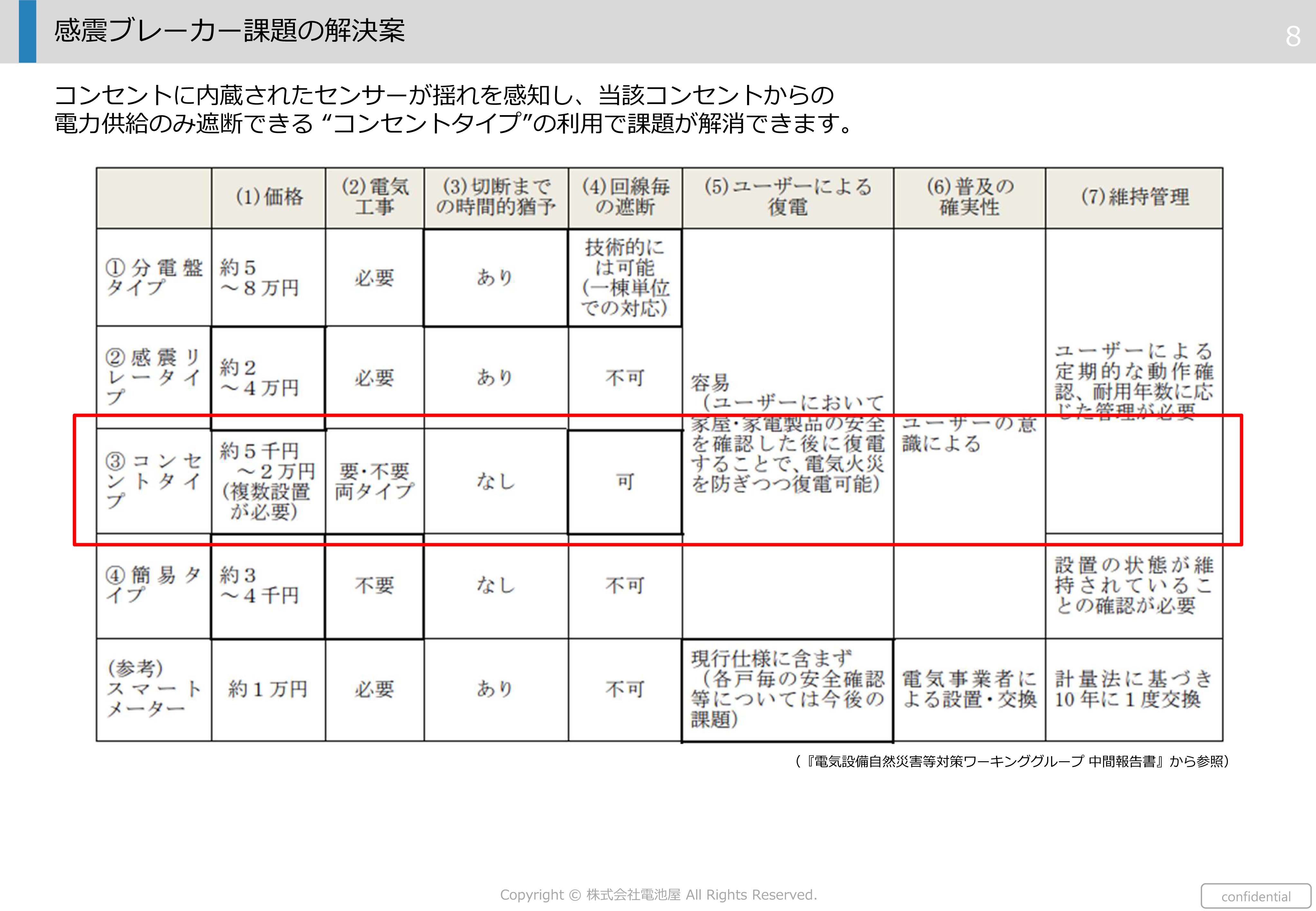 次に感震ブレーカーの課題。感震ブレーカーにも色々なタイプがあります。これに対し、家庭内で使われる電源の中で、火災の原因になるものはある程度特定されているので、コンセントタイプの個別遮断タイプを選定すると、必要なところだけに取り付けるという方法がとれます。