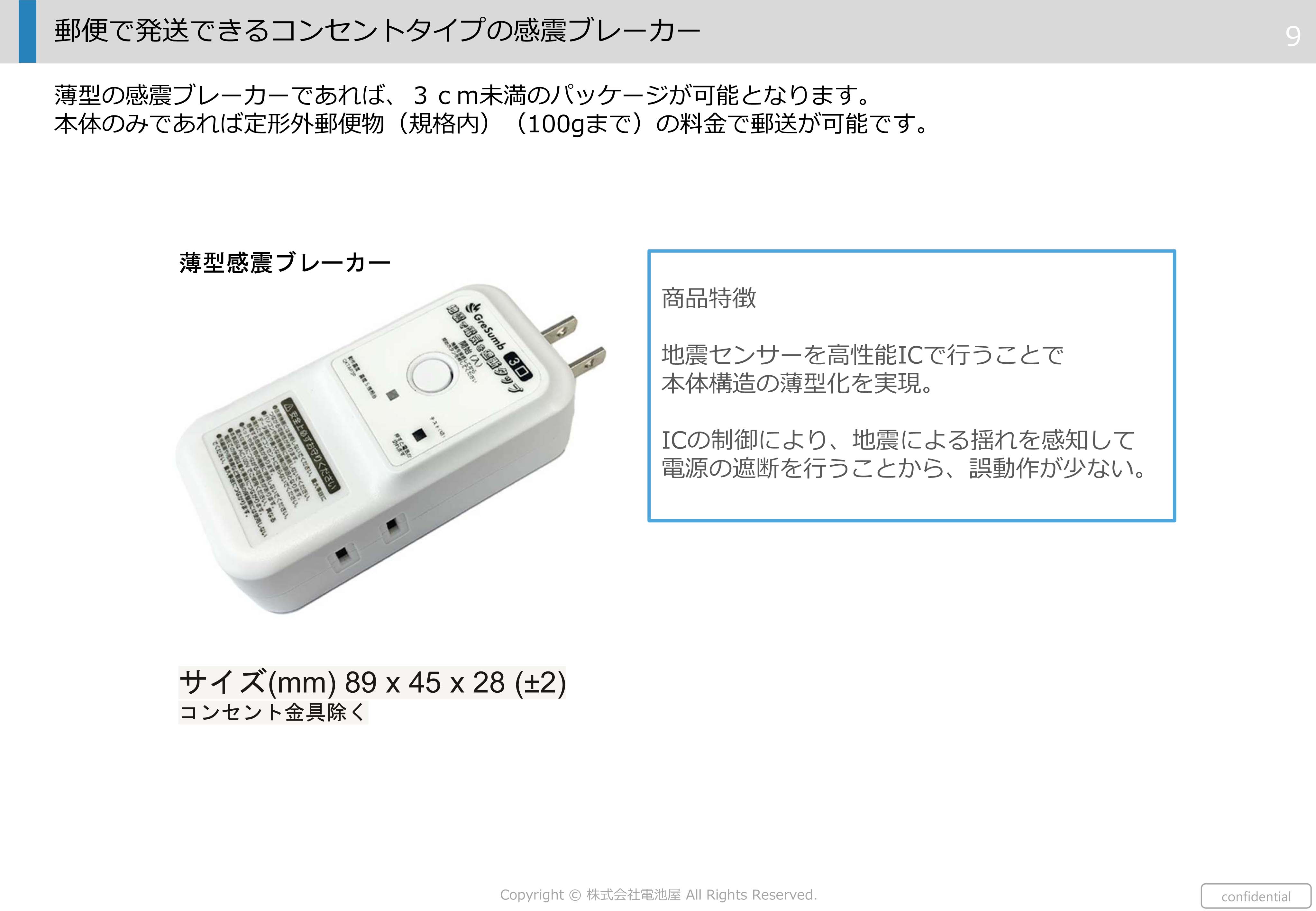 上記が、令和7年4月にリリース予定の、厚み4センチ未満の感震ブレーカーです。ポストに入るサイズなので、定型郵便の袋に入れて切手で送ることも可能。センサーをIC制御にすることで非常に薄く作れたという点がポイントです。それに加えて、何かがぶつかったり、動かしたりといった地震以外の揺れで作動することはなく、従来からの感震ブレーカーの課題も解消しています。