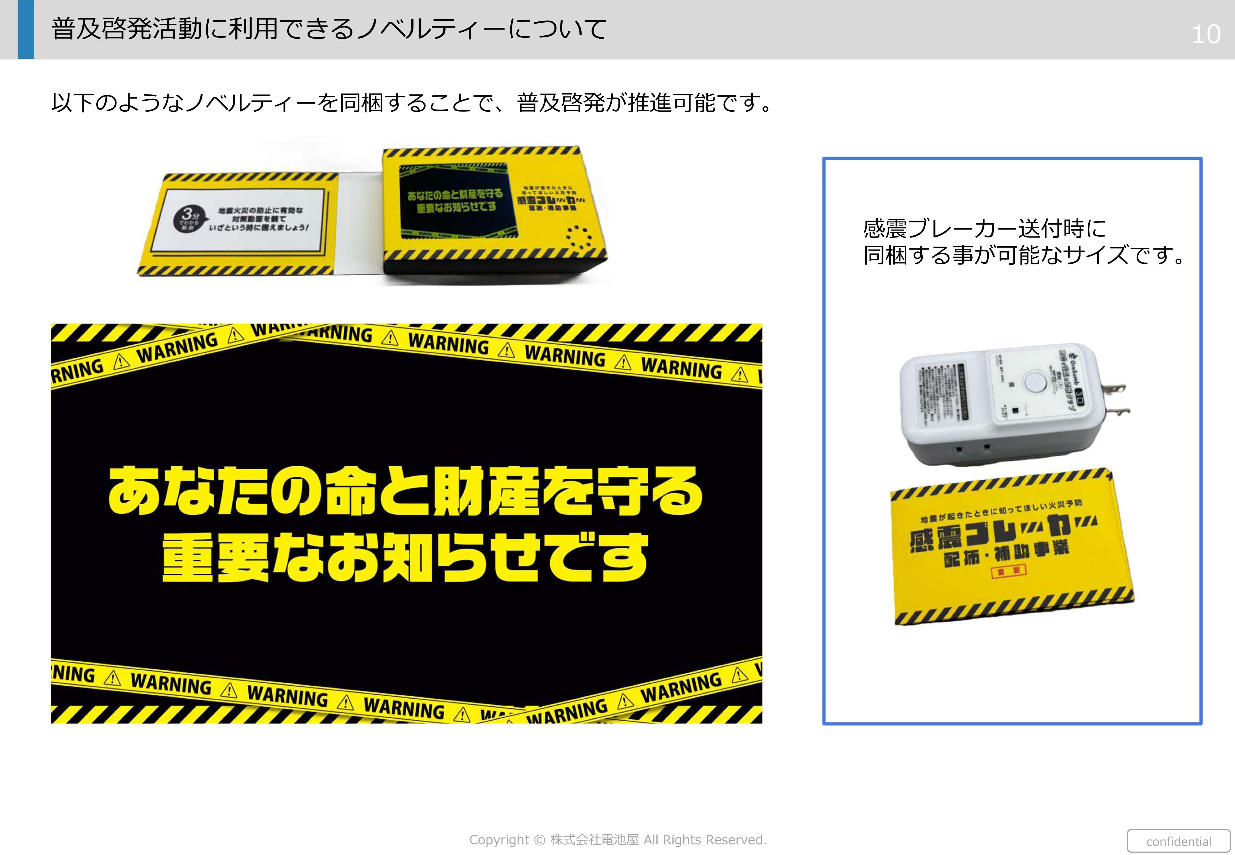 また、商品の普及にはPR活動も必要になりますが、当社では本体に同梱して、動画で感震ブレーカーの必要性を訴求するノベルティも用意しています。動画の内容は自由に変更可能です。