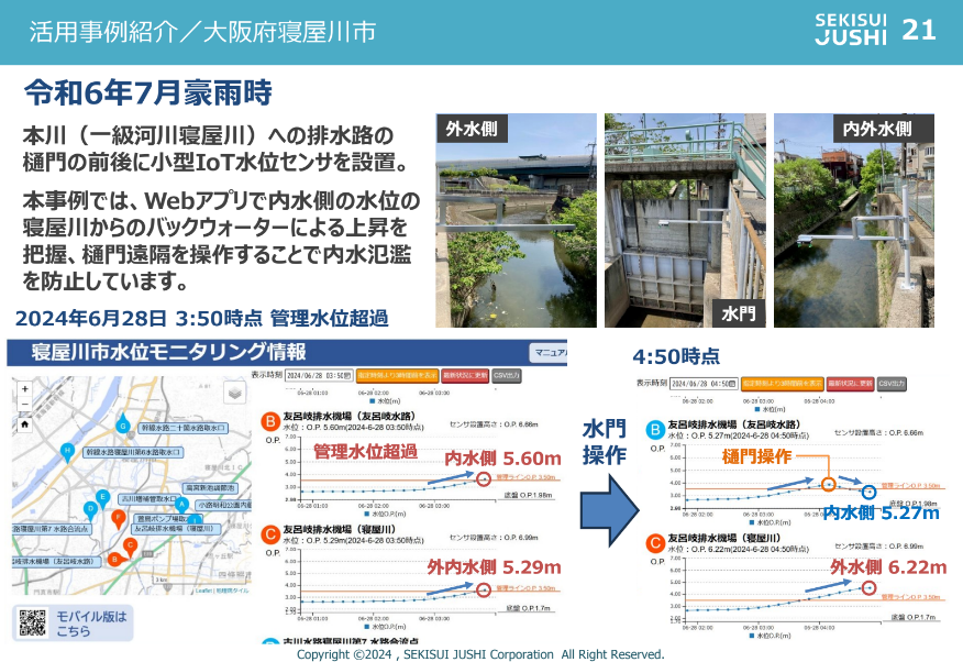 4つ目は、遠隔から水位を監視でき、アラートで水位上昇を察知できる点。こちらは後ほど自治体での事例を用いて説明します。