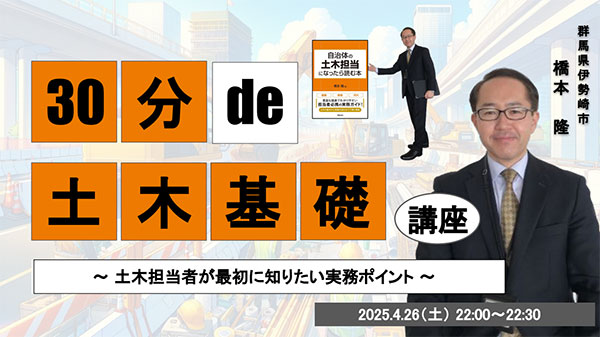 また、今月から土木担当向けの動画を無料で視聴できるようになりました。公務員限定にはなりますが、オンライン市役所(※1)に参加していただくと、いつでも気軽に「30分de土木基礎講座」を視聴できます。ぜひ本書や動画を活用しながら、徐々に専門分野も理解していきましょう。