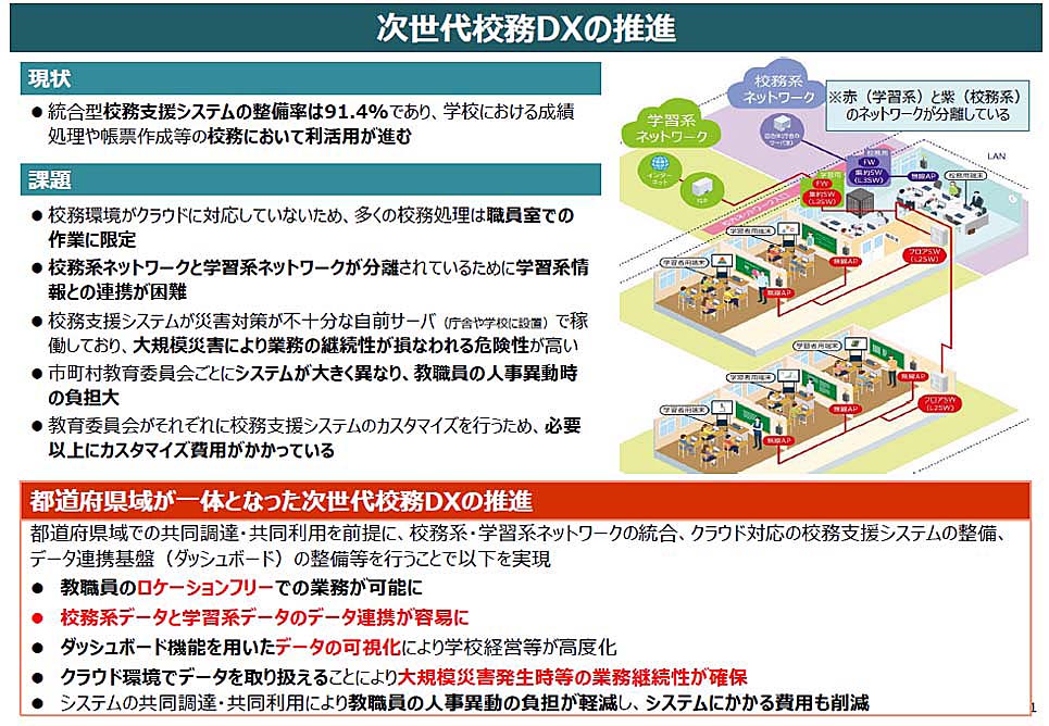 こうした課題の解決に向けて、文部科学省では都道府県域が一体となった次世代校務DXを推進しており、都道府県域での共同調達・共同利用を前提として、校務系・学習系ネットワークの統合や、クラウド対応の校務支援システムの整備を支援しています。