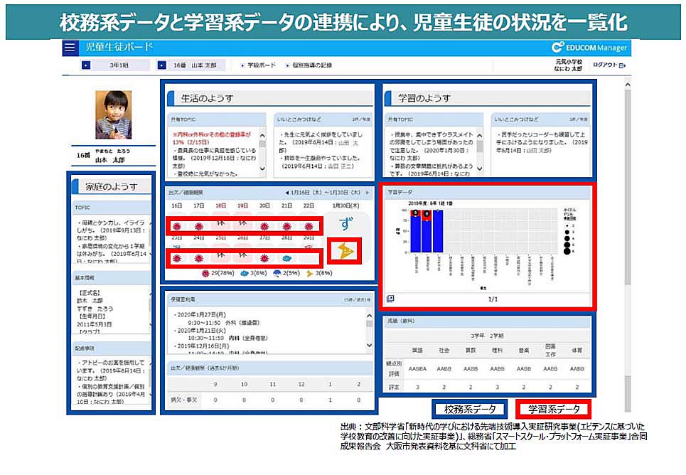 上図のダッシュボードで、赤枠部は学習系データ、青枠部は校務系データを示しています。これらのデータが一覧性を持って表示されることで、より客観的な児童生徒の見取りが可能になります。