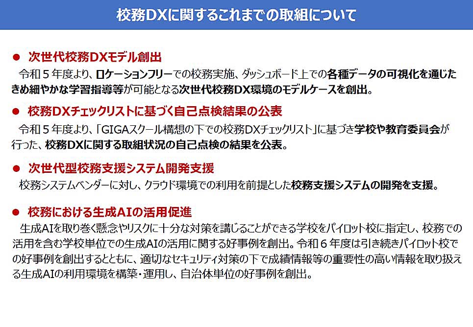 次年度以降については、「GIGAスクール構想支援体制整備事業」として補助金による支援を行っています。我々としては、次世代校務DX導入済みの自治体の割合を、令和11年度までに100%にすることを目指しています。そのため、都道府県域での共同調達などを前提に、自治体の次世代校務DX環境整備に係る初期費用や準備費用を支援するための予算を措置していますのでぜひご活用ください。