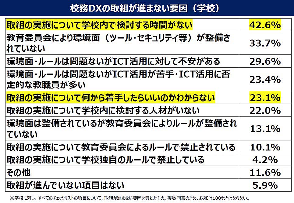 この値から、学校・教育委員会ともに取り組みの達成率は伸びていることが分かります。その半面、「校務DXがなかなか進まない」という声もあり、調査したところ以下のような要因があることが分かりました。