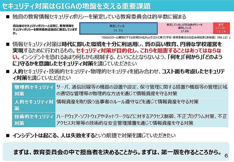 教育現場でのセキュリティ対策は、ソフトウェアの導入などを含む技術的セキュリティだけでなく、物理的セキュリティ、人的セキュリティを合わせて講じていくことが重要。また、情報セキュリティに完全・絶対はないので、インシデントは起きるという前提で対策を講じることが重要です。まずは教育委員会の中で担当者を決め、未策定の自治体においては第一版をつくるところから始めていただければと思います。