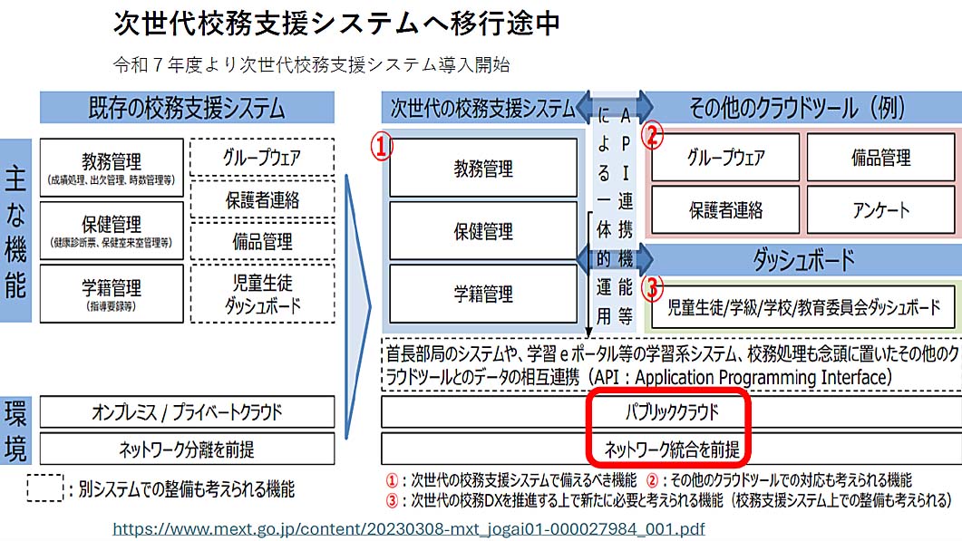 井上:上図の赤枠に、パブリッククラウドとネットワーク統合というのがあります。校務系と学習系が分離した現状があり、まずネットワーク環境を変える必要がある。また、校務支援システムの多くは“クラウド対応”とされていますが、パブリッククラウドに置くことができても、ネイティブなクラウド対応の製品にはなっていないという現状もあります。セキュリティ面で問題があるとか、API連携がうまくできていないなど、クラウドに置いただけでは変わらないので、これを解決しないと本当の移行が進みません。