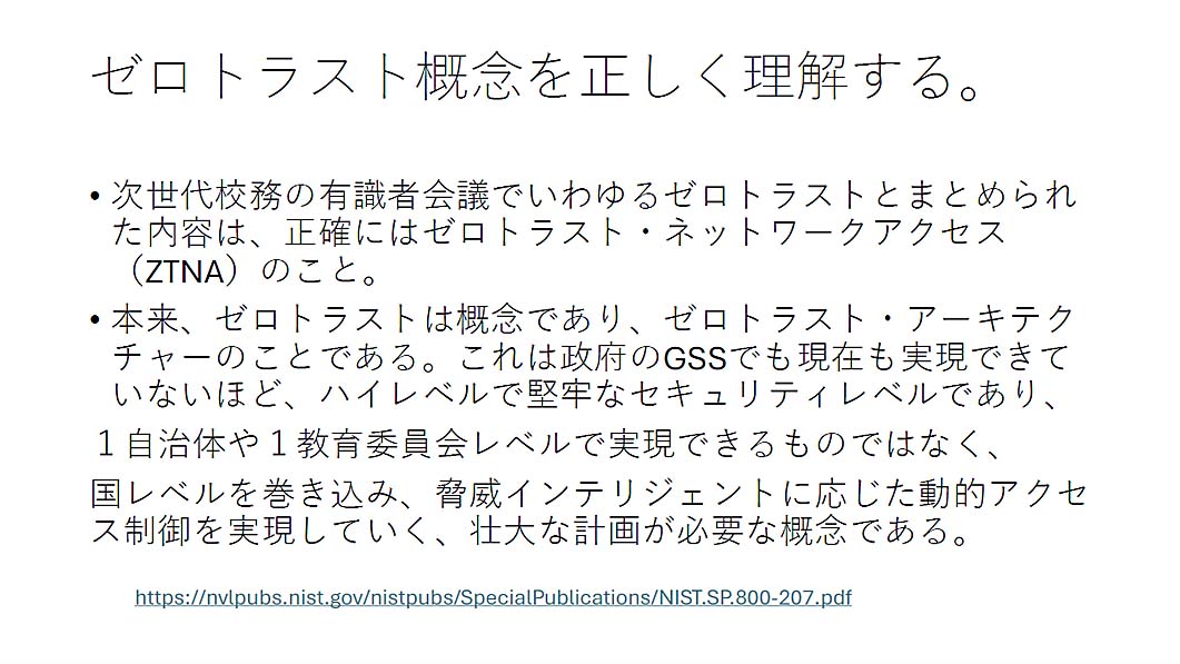伊藤:ありがとうございました。ここで、改めてゼロトラストの概念を整理します。有識者会議でゼロトラストと呼ばれているのは、校務のクラウド化に伴った“ゼロトラスト・ネットワークアクセス”を指しています。本来、ゼロトラストは“ゼロトラスト・アーキテクチャ”を意味し、もっと壮大なものです。