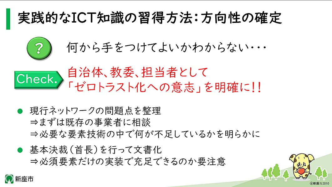今回の教育ネットワーク更改の場合は、携わった職員が過去に情シスを経験してはいました。とはいえ、今まで行政側のネットワークには存在しなかったゼロトラストの考え方など、新たに学ぶべき情報は多々ありました。現行の課題を整理することと併せ、まずゼロトラスト化に向けた自治体としての意識を統一し、足元を固めておくべきだと考えています。