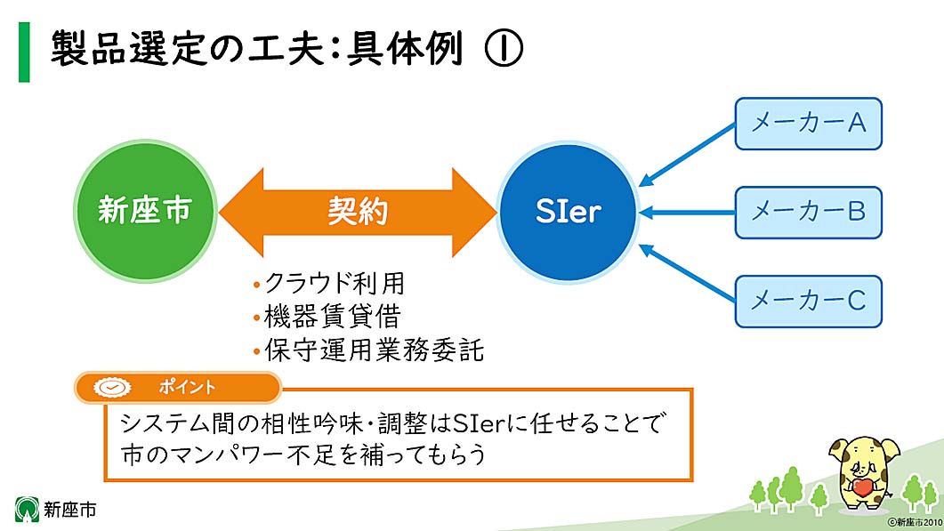 SIerは、教育ネットワークの運用から保守にわたって主体的に動く業者、メーカーは各種システムの開発をしている業者、というイメージです。この分類により、上図のような構成となり、市の担当者は本来の業務に専念できます。契約も1社との締結なのでシンプルです。SIerにはメーカーの統率や調整などを任せ、立場を自覚させるという面でも意味がありました。